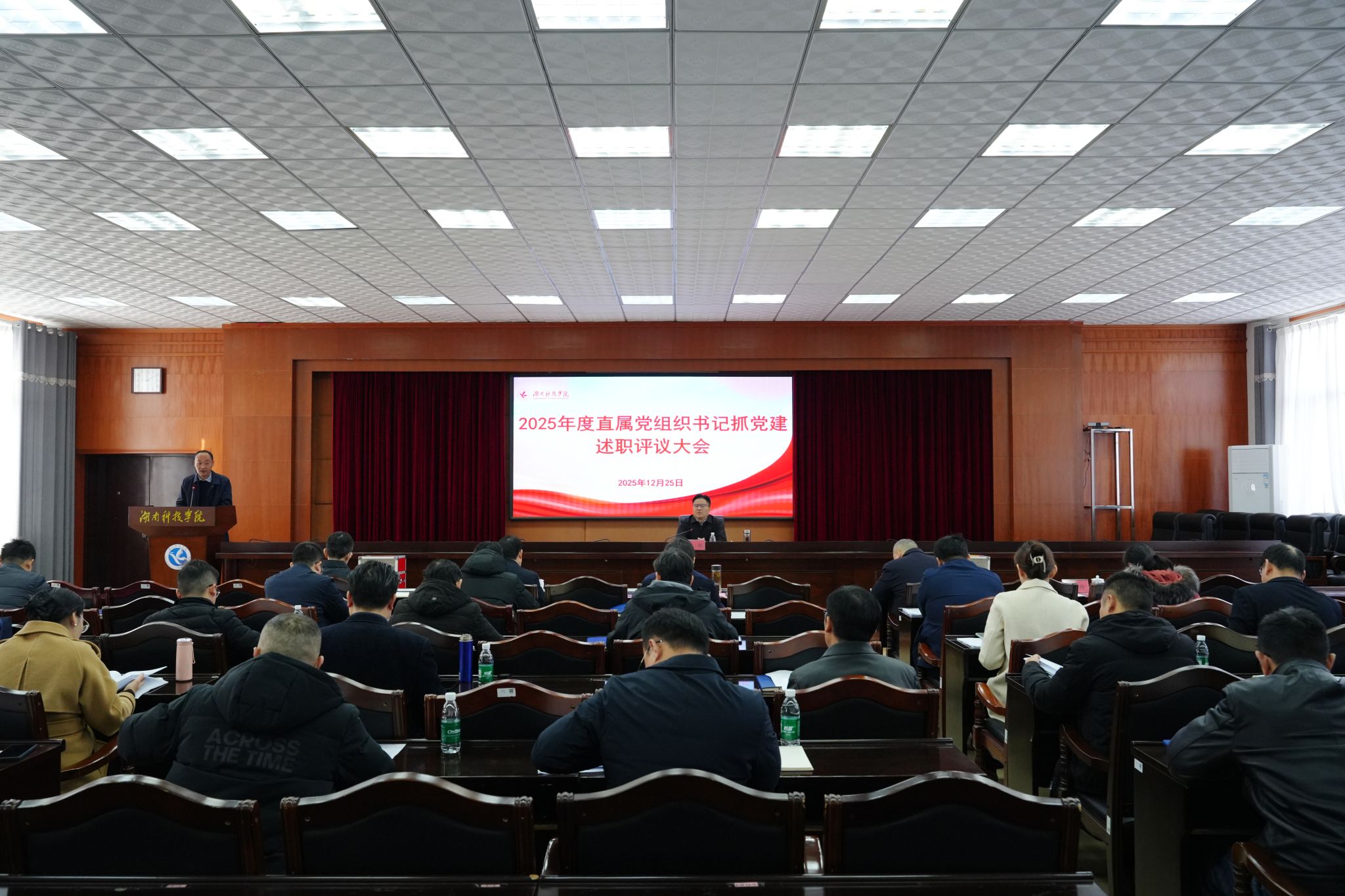 本网讯(通讯员 傅翠辉)12月25日,学校召开2025年度直属党组织书记抓党建述职评议大会。全体校党委委员,党的建设工作领导小组成员以及各直属党组织书记参加会议,会议由校党委书记李钢主持。
