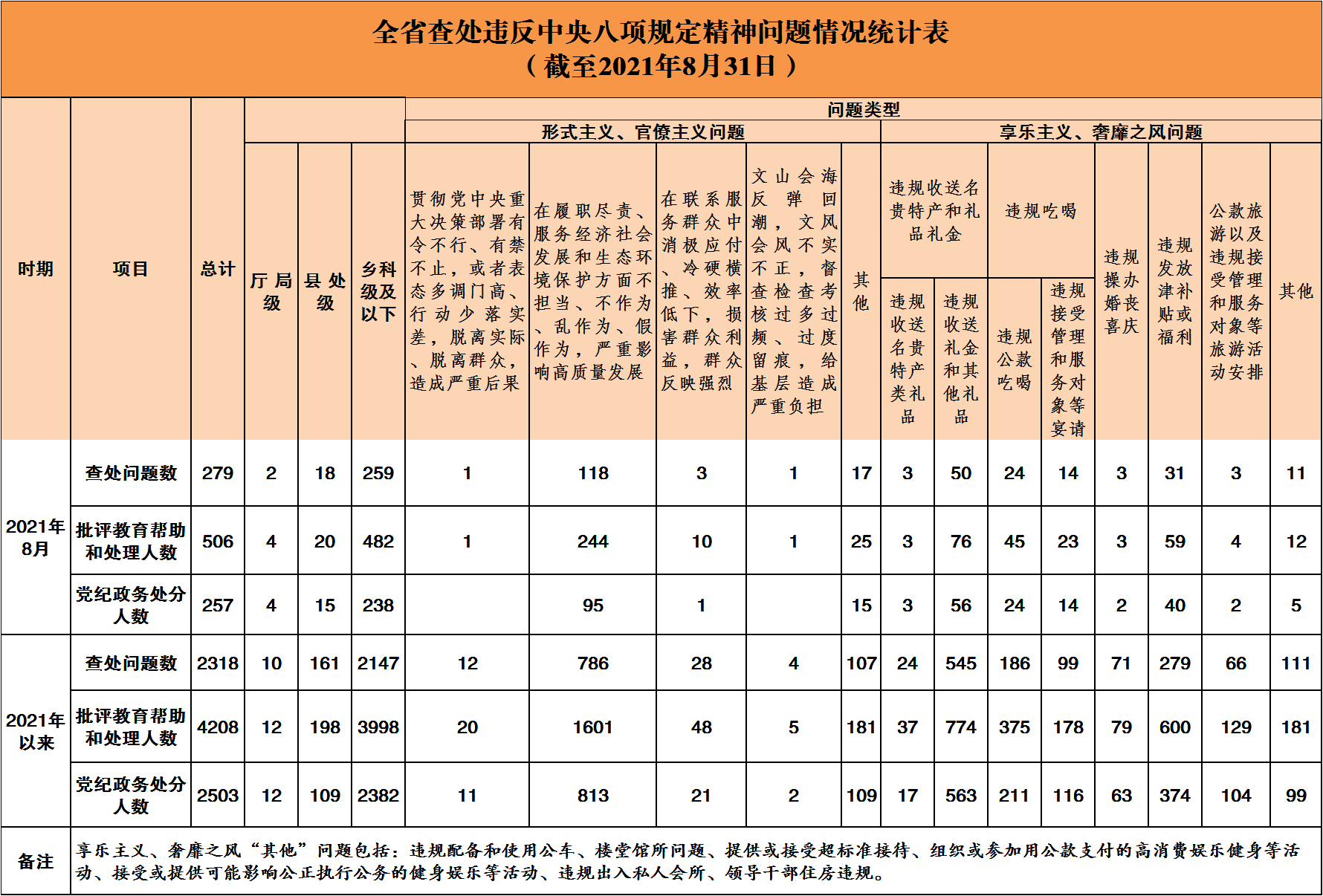 湖南省纪委监委深入贯彻中央纪委国家监委工作部署,在全省各地各部门各单位建立了落实中央八项规定精神情况月报制度。2021年以来,截至8月31日,全省查处违反中央八项规定精神问题情况如下: