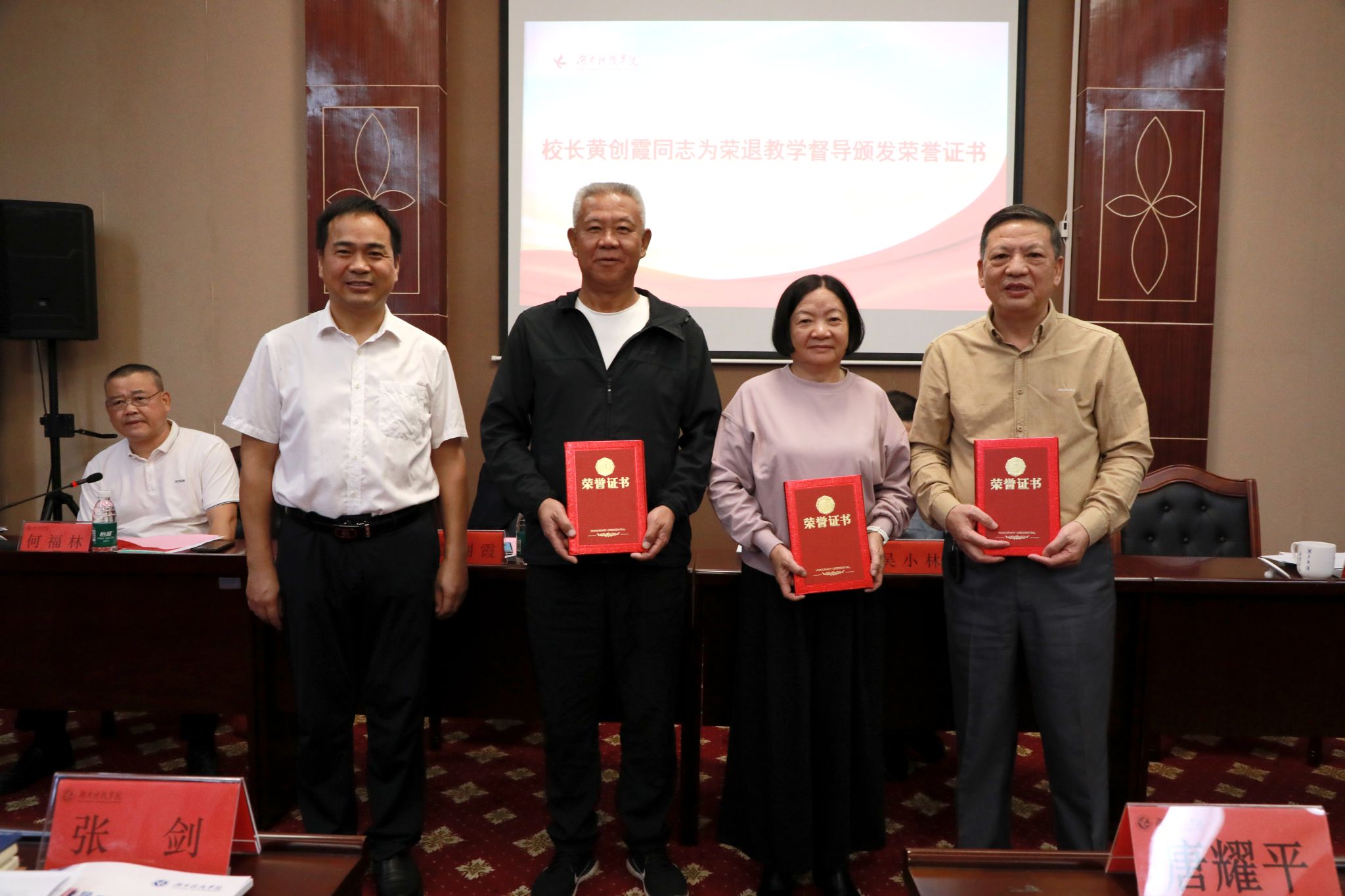 黄创霞为荣退教学督导颁发荣誉证书并为第四届教学督导团督导颁发聘任证书。