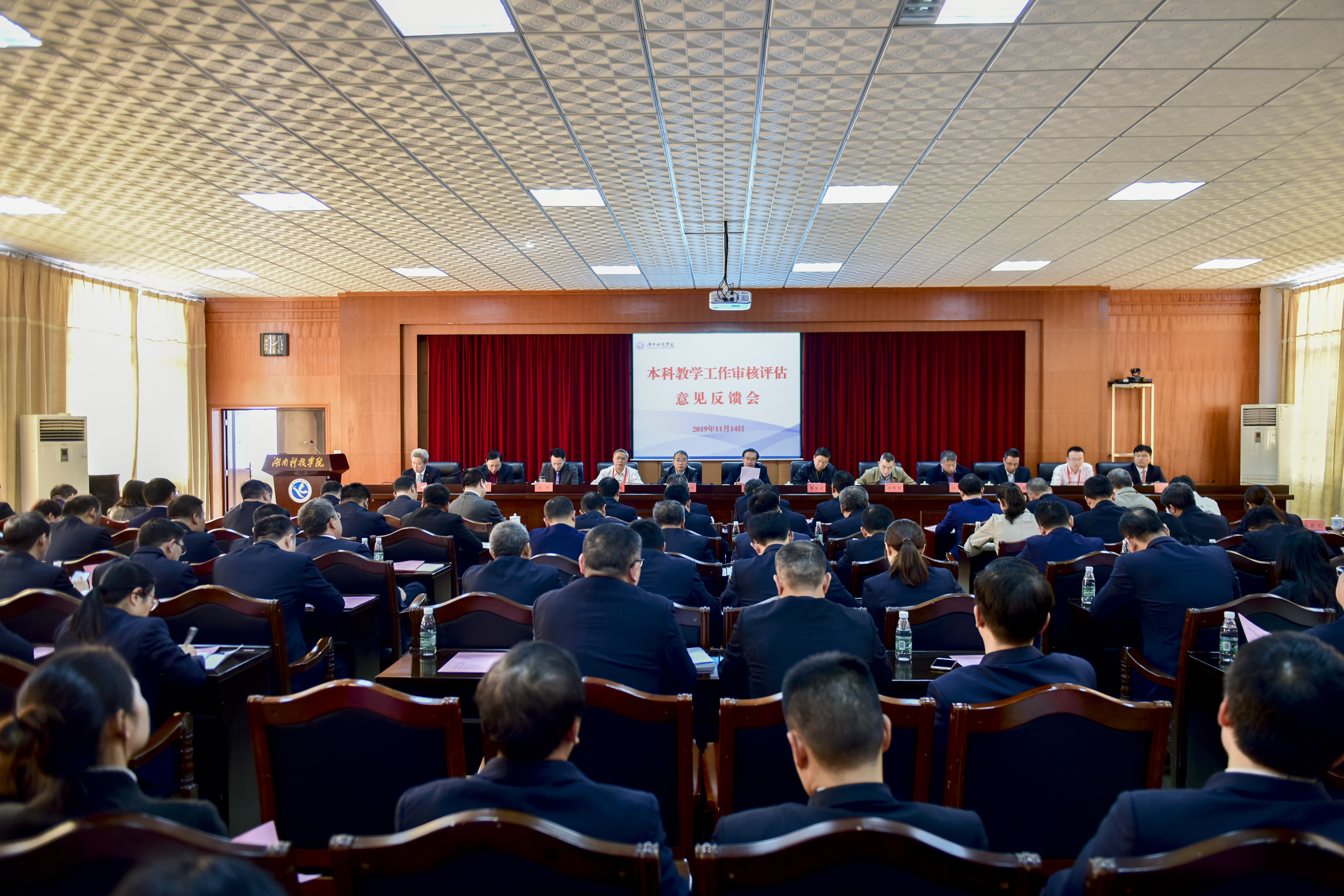 11月14日,学校举行本科教学工作审核评估专家反馈会,审核评估专家组组长、华中师范大学原副校长李向农,云南大学副校长丁中涛,湖南师范大学副校长蒋新苗,广西师范大学原副校长钟瑞添,福建农林大学教务处长吴祖建,武汉音乐学院学科建设与规划办公室主任陈明,湘潭大学教务处长喻祖国,湖南理工学院教育科学学院院长刘理,慧科集团高级副总裁、慧科研究院常务副院长管刚,省教育厅党组成员、主任督学、副厅长、工委委员唐亚武,省教育厅高教处处长曾力勤,副处长王荣,校党委书记曾宝成,校长李钢,全体校领导、党委委员,学校全体副处级以上干部参加。反馈会由李向农主持。