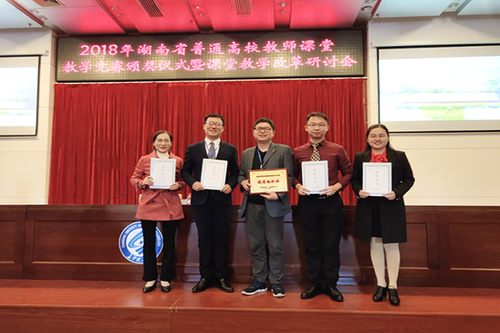 10月27日至28日,湖南省高校教师课堂教学竞赛在长沙理工大学落下帷幕。今年会推荐的5位参赛教师中4位进入现场决赛,其中理学院廖春艳(理科组)、传媒学院李超(文科组)、土木与环境工程学院罗雄文(工科组)和电子与信息工程学院段华斌(工科组)四位教师喜获一等奖,且同时荣获湖南省教育工会颁发的“湖南省普通高校教学能手”荣誉称号。今年会获一等奖数量与湖南师范大学、湖南大学并列第一,获得优秀组织奖,为历年来在该赛事上成绩最好的一次。