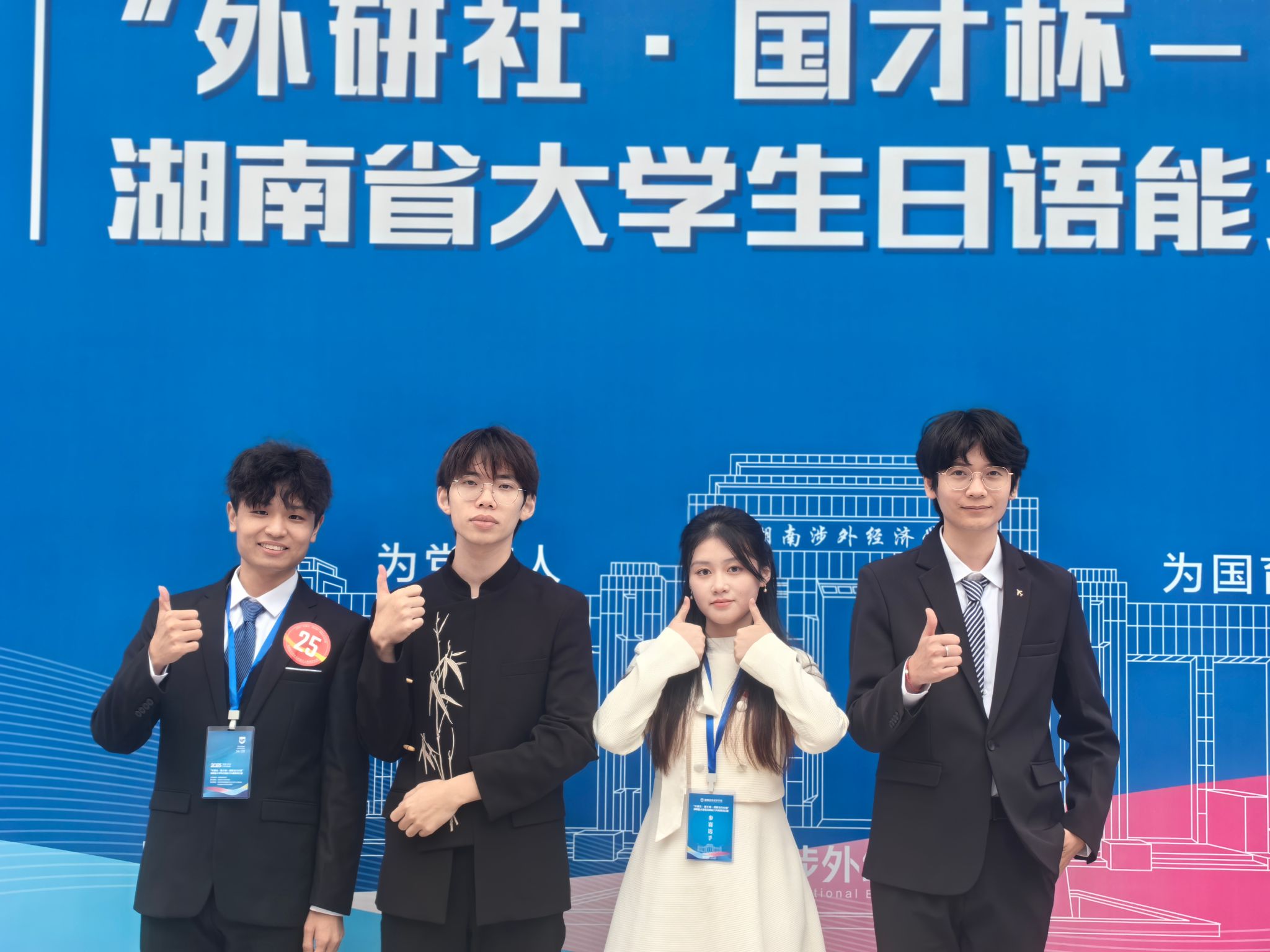 在10月25-26日举行的日语能力大赛中,全省18所高校的72名研究生与本科生同台竞技,赛事成绩由线上综合测试与线下演讲比赛加权评定。今年会日语系学子延续优异表现,邓新宇、刘羽茜同学荣获省级一等奖并晋级全国总决赛,唐博、李韬同学分别荣获二、三等奖,其中邓新宇同学以本科生组第一名的综合成绩脱颖而出。同时,学校代表队荣获湖南省团体一等奖。这是继2024年于璟同学斩获省级一等奖并勇夺国赛金奖后,日语系学子再次取得的好成绩,展现了专业高质量发展的良好态势。