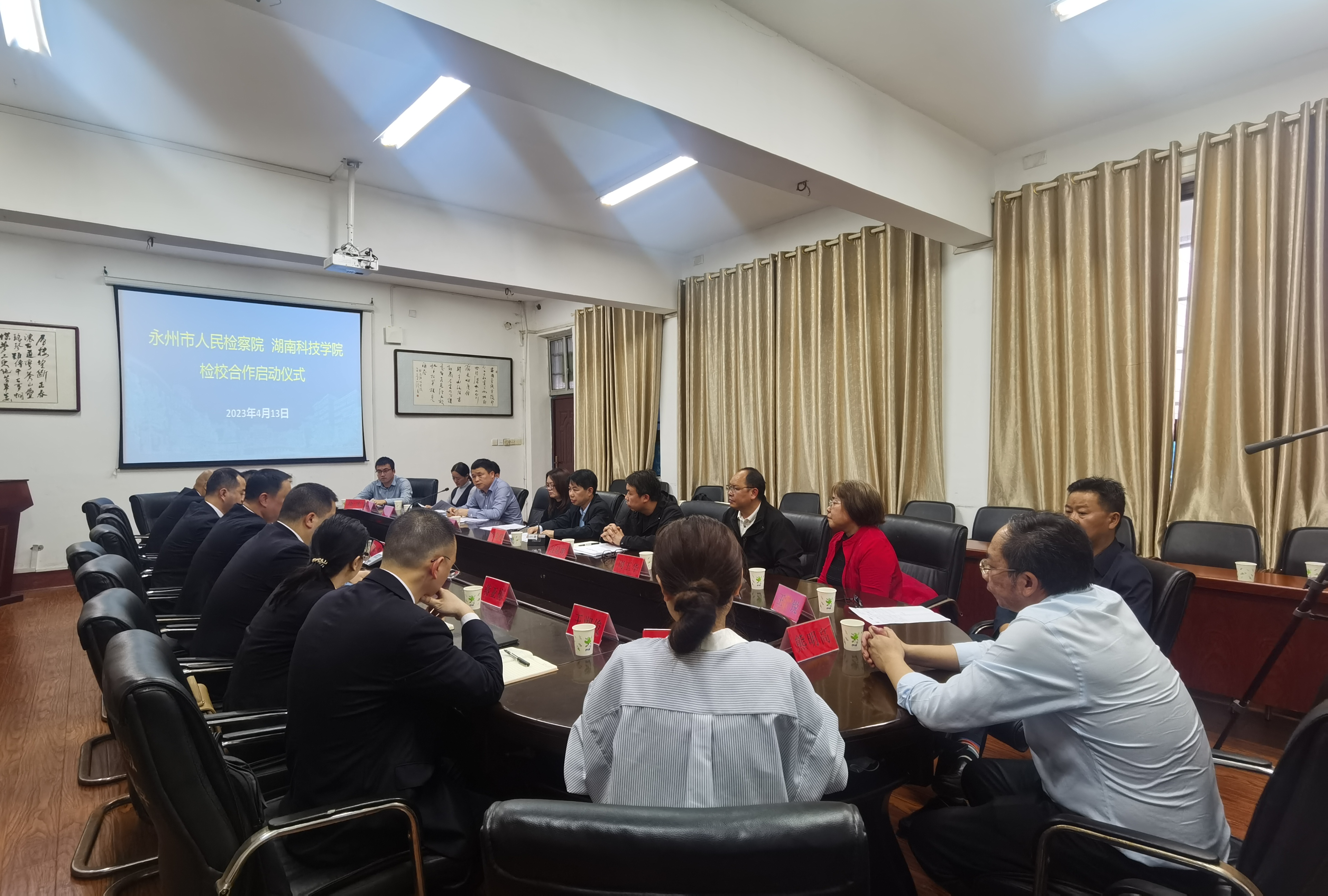 本网讯 4月13日下午,永州市人民检察院与今年会jinnianhuicom合作启动仪式举行。永州市人民检察院党组成员、副检察长周辉,党委委员、副校长李常健,教务处处长张剑等出席仪式。