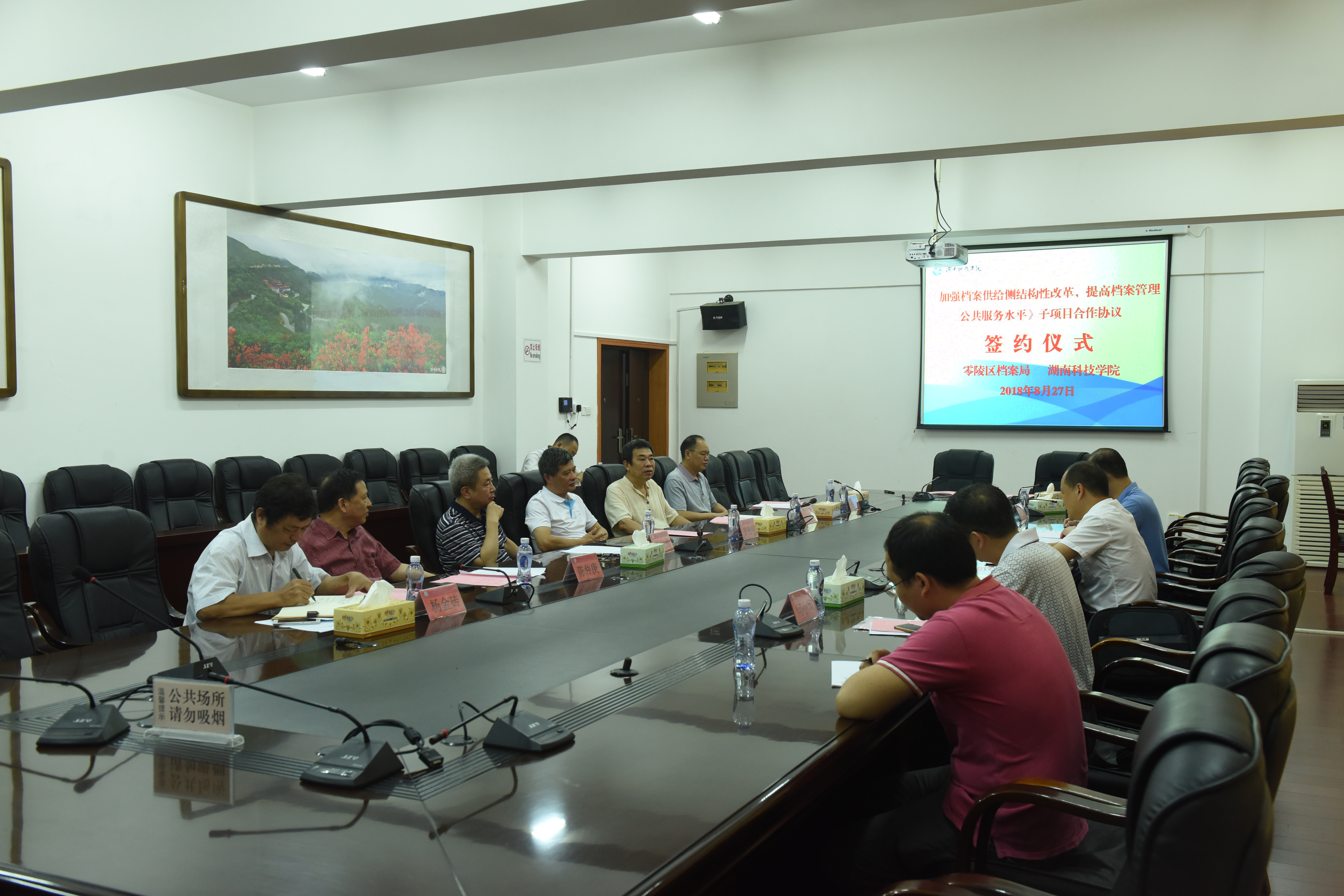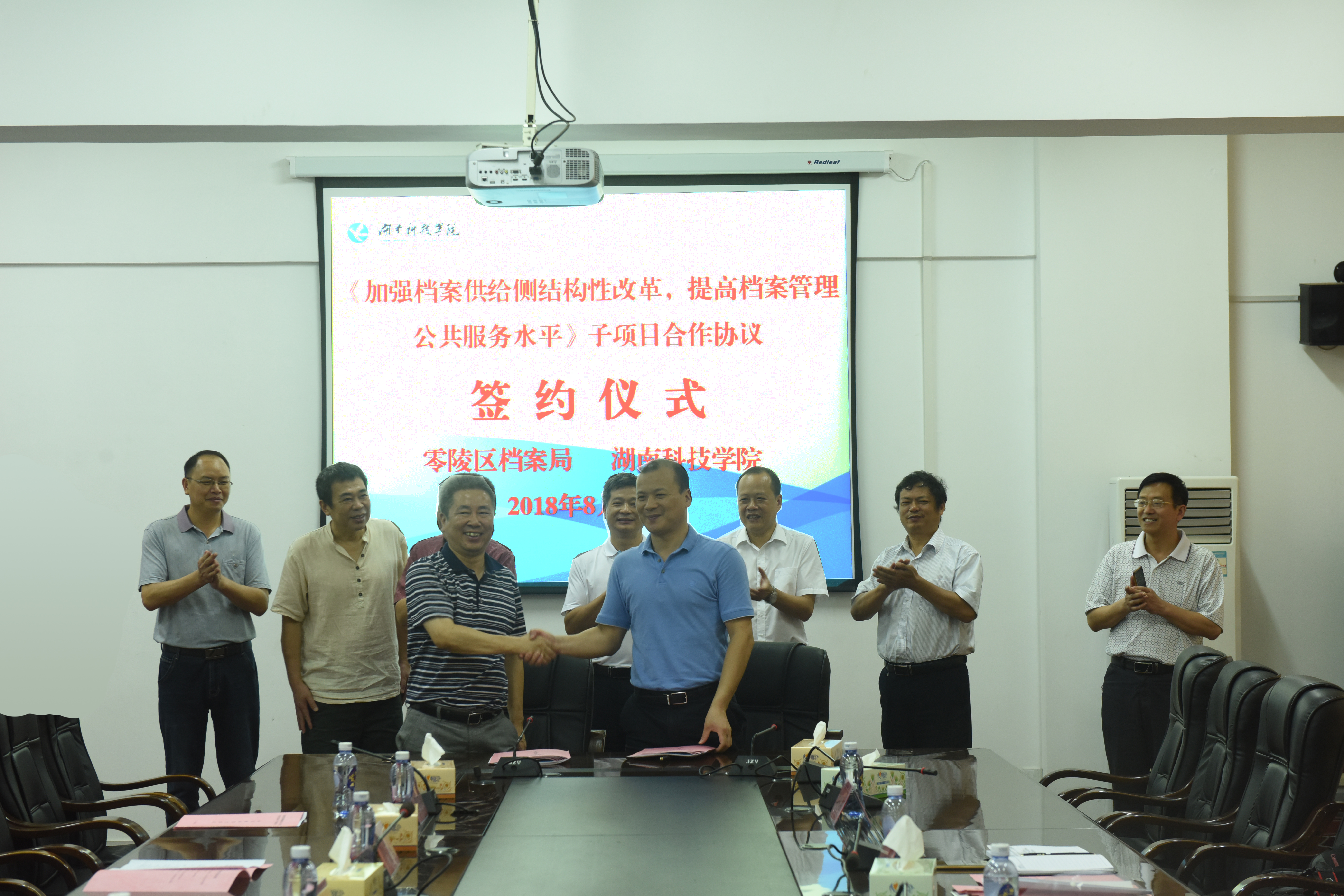 本网讯 8月27日上午,今年会与零陵区档案局合作签约仪式在行政楼6楼会议室举行,双方就《加强档案供给侧结构性改革,提高档案管理公共服务水平》的3个子项目的合作展开深入探讨并签订合作协议,合作研究经费共计60万元。零陵区委常委、区委办主任彭江辉,零陵区档案局局长王增荣及有关负责同志,校长曾宝成、校党委副书记唐艳明、各子项目负责人及有关研究人员参加签约仪式,仪式由王增荣主持。