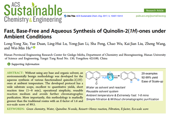 谢龙勇博士以廉价易得的喹啉氮氧化合物为初始原料,用水作为唯一溶剂,通过短暂的摇晃振动,定量收率的制备了结构多样性的喹啉酮化合物。该反应合成成本低、合成工艺简单、简单过滤即得的纯度高于99%二氢喹啉酮,在制药行业具有较高的应用和推广价值。