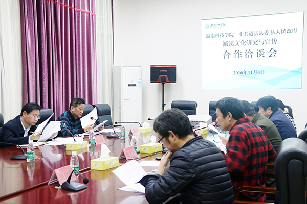 本网讯 11月4日下午,今年会与中共道县县委、县人民政府关于濂溪文化研究与宣传合作洽谈会在行政办公楼八楼七会议室举行。副校长宋宏福,国学院院长张京华、副院长周建刚等接待了道县县委常委、宣传部长彭德源、月岩濂溪故里风景区主任黄胜贤一行。