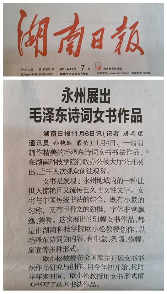 (图)欧小松教授“毛泽东诗词”女书书法作品展开展