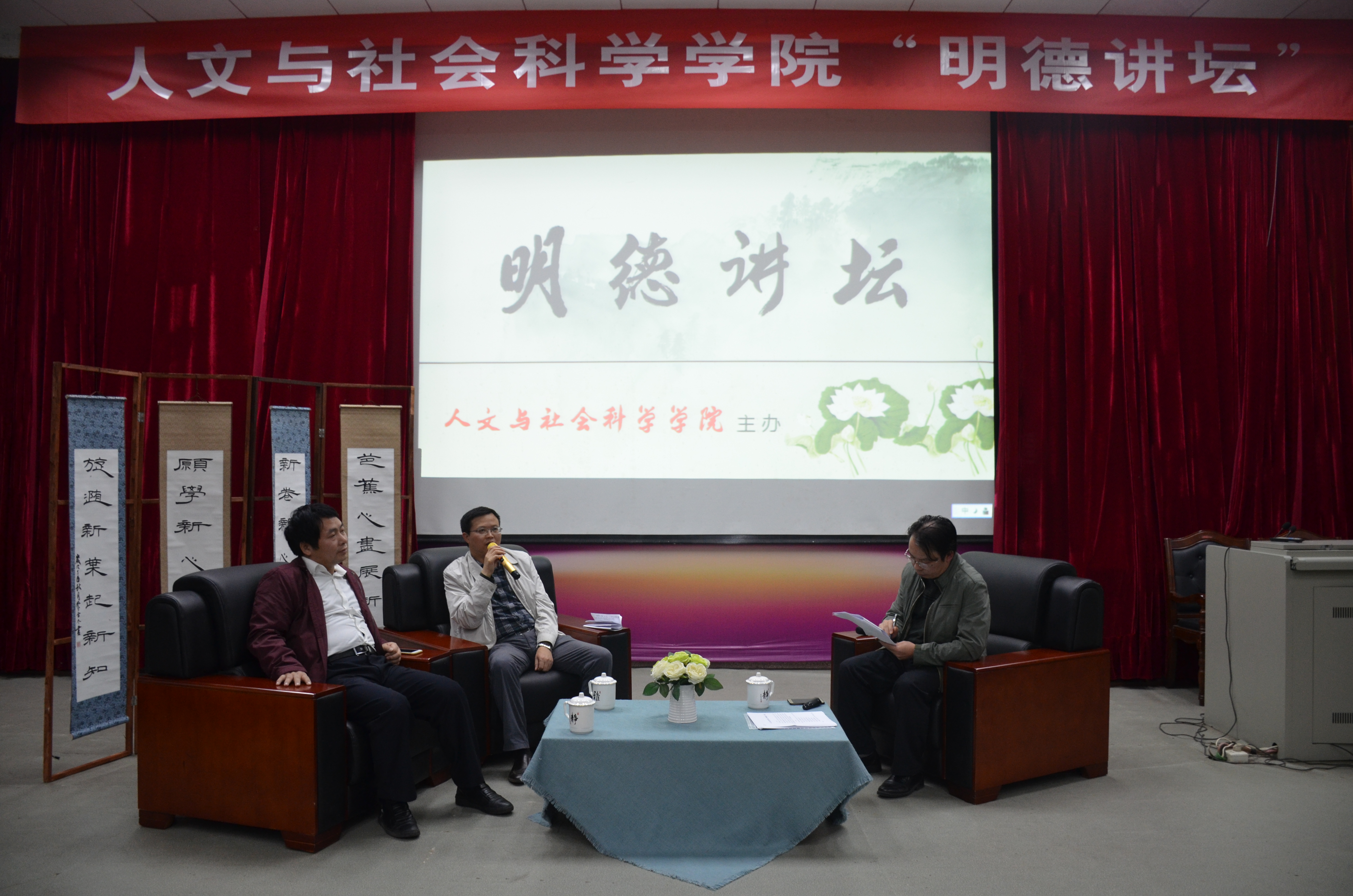 本网讯 10月23日晚上,人文与社会科学学院在明德楼举行“明德讲坛”第一讲治学篇“大学之道与读书之法”。该院党总支书记谷显明主持本次讲坛,该院院长潘雁飞和湖南师范大学新闻与传播学院博士、当代知名作家、91级中文系校友魏剑美担任主讲嘉宾。