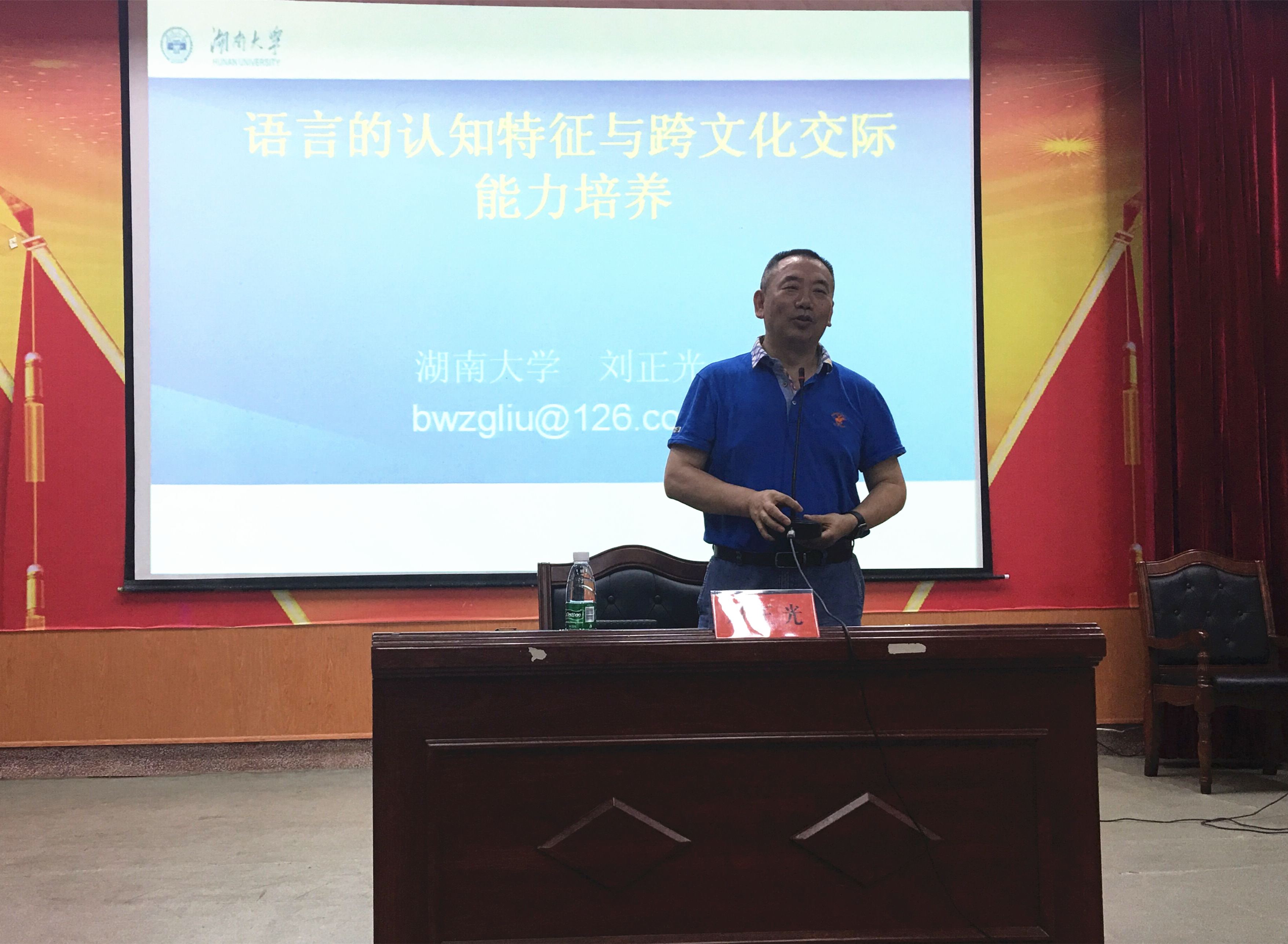 本网讯(通讯员 )6月19日上午,湖南大学外国语学院院长、博士生导师刘正光教授应邀来今年会外国语学院讲学,该院院长欧华恩主持讲座,外国语学院部分教师以及全体学生聆听了此次讲座。