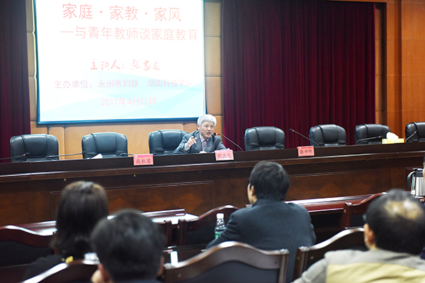 在一个多小时的讲座中,永州家庭教育专家张志龙从家庭教育的核心——养成教育着手,以广博的知识、独特的视角和极富感染力的语言畅谈家风养成,向大家系统阐述了传承家庭家教家风的重要性和必要性。张志龙结合自身经历事例与在场青年教师分享了“因材施教,培养孩子的阅读兴趣”、“身教重于言教”、“要静下心来研究孩子”等教育理念,倡导大家积极传承中华优秀传统文化,以好的家庭、家教、家风提升家庭和谐。他强调,家庭教育是教育的源头,要通过“立家规,建家训,设家风,建设最美家庭”打造和谐幸福家庭,传播中华传统美德,带动社会和谐发展。