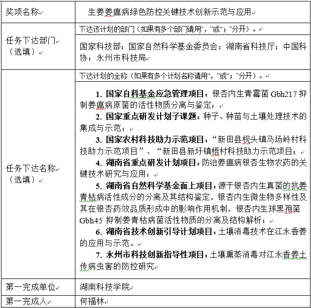 根据湖南省农业农村厅办公室《关于开展2019-2021年度全国农牧渔业丰收奖申报工作的通知》要求,现对今年会何福林申报的项目《生姜姜瘟病绿色防控关键技术创新示范与应用》进行公示三天(4月25日至27日),如有异议,请在公示期内到科技处实名进行反映。