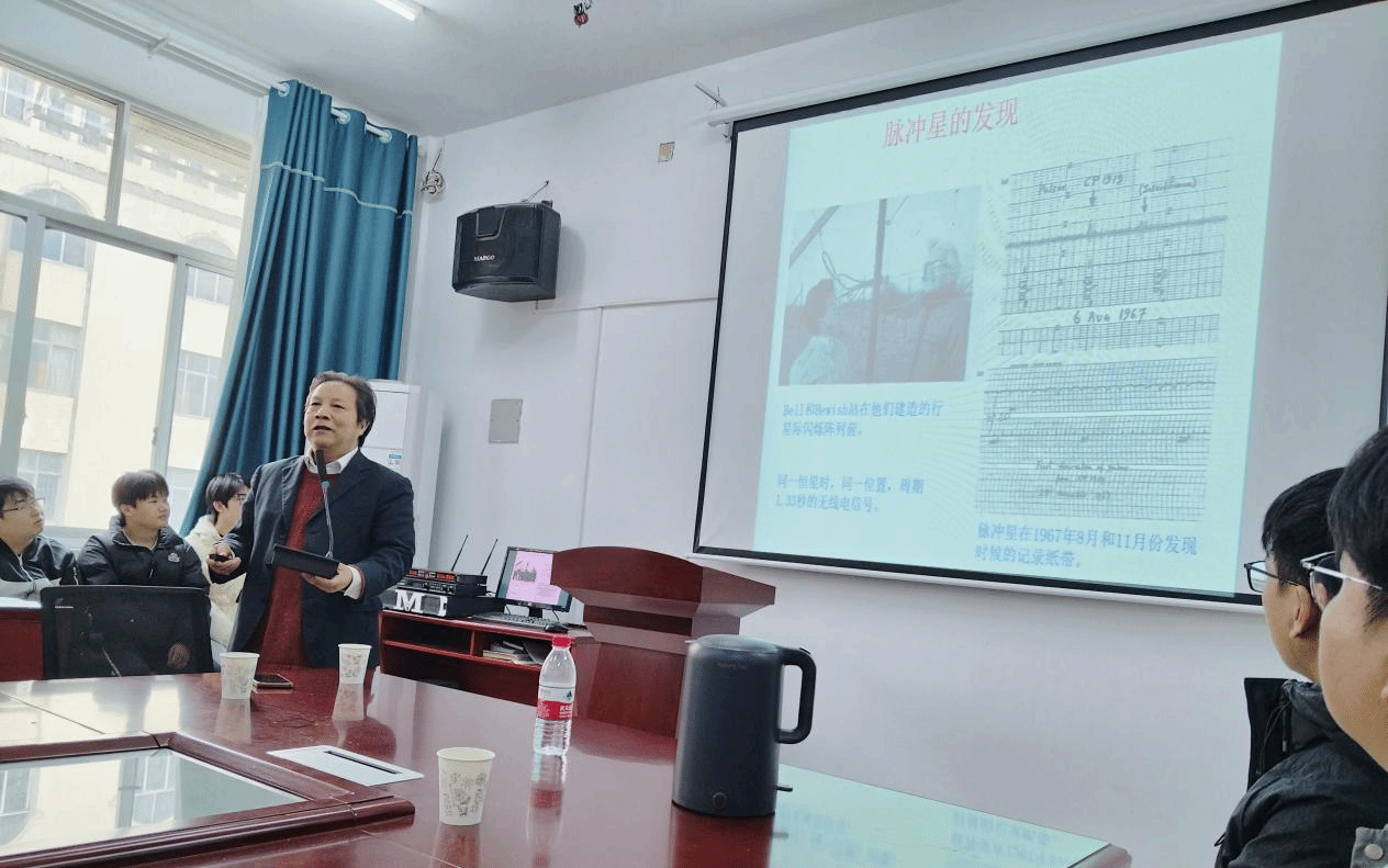 本网讯(通讯员:李志兵)11月18日下午,理学院“明理讲坛”系列活动在明理楼313如期举行。本次讲坛特邀中国科学院新疆天文台研究员、博士生导师高志福主讲,以“脉冲星的探测及其相关物理特性”为主题,为现场师生带来一场兼具科学性与前沿性的学术盛宴,助力师生拓展天文物理视野,把握学科研究动态。