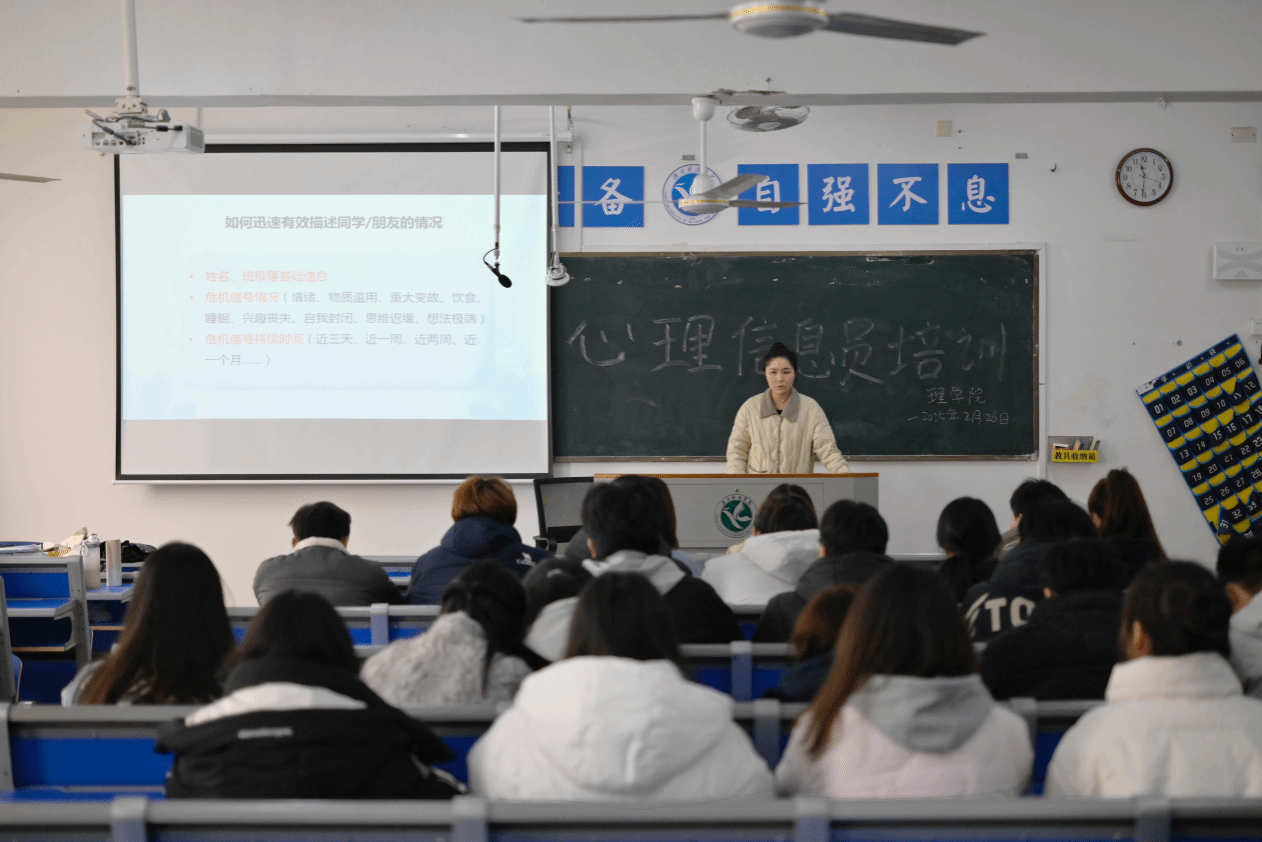 本网讯(通讯员:石庆湘)新学期伊始,为进一步加强心理健康工作队伍建设,提高学院心理信息员工作能力,理学院于2月26日中午在明理楼302开展了以“凝心聚爱、朋辈互助”为主题的心理信息员培训。本次会议理学院党总支副书记欧阳素勤、全体班长、心理委员、心理信息员、学生党员参加,由心理专干刘静主持。