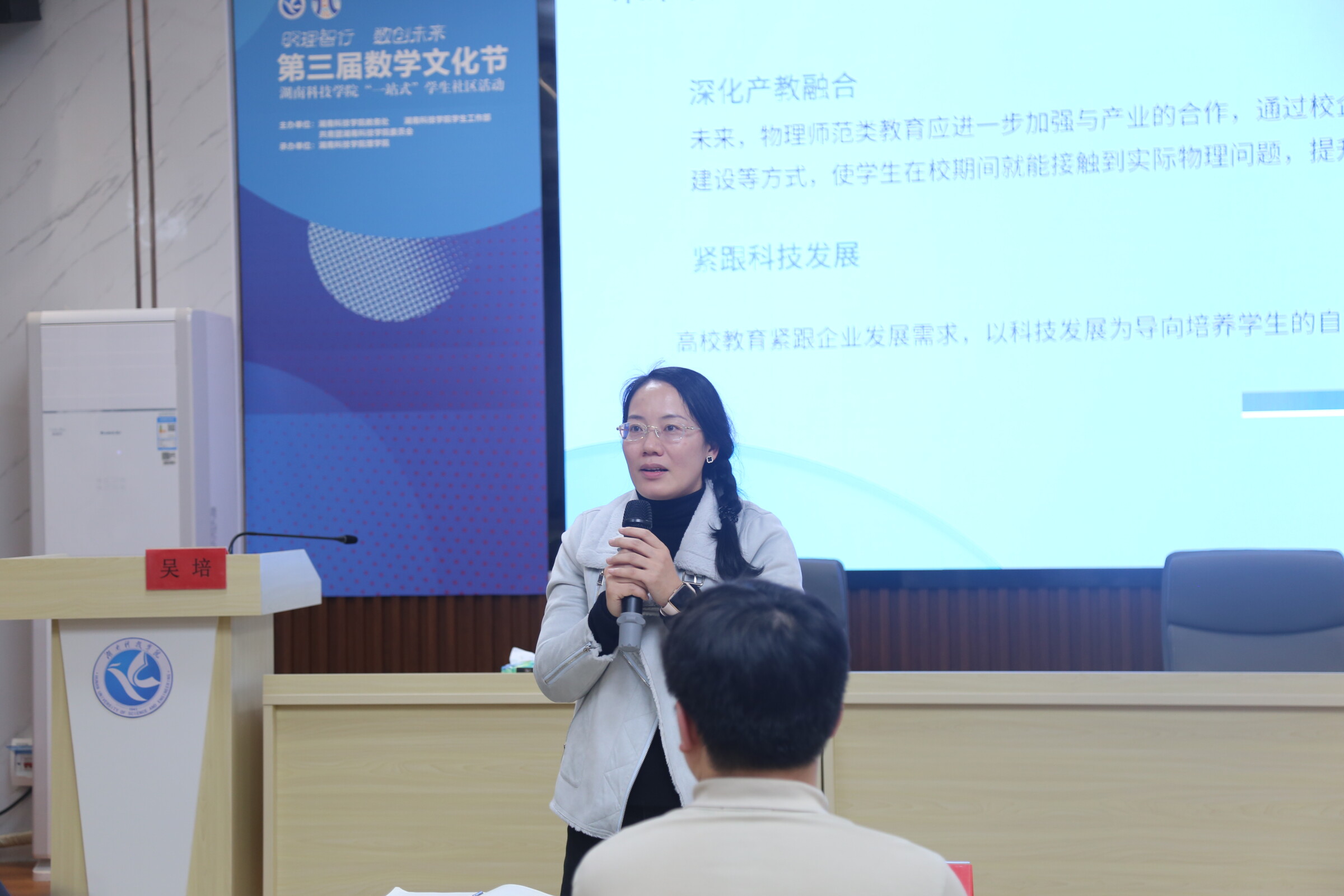 讲座伊始,主讲人周忠夏详细介绍湖南推出支持大学生创业的“七个一政策”,积极鼓励学子参与创业大赛,随后从“项目从何处来”、“项目何处打磨”两个方面对2025年金种子杯大赛和中国国际大学生创新大赛的赛程安排进行讲解。周忠夏老师以金色年华团队的“沐领社区食堂的积极老龄化智慧支持”的创业项目为例,向师生展示他们的项目成果,并且从“科创新”、“农创新”、“文创新”等多个角度总结如何进行创新创业。最后吴培老师以科研思维思考大赛,用自己的创业经验,启发性十足。