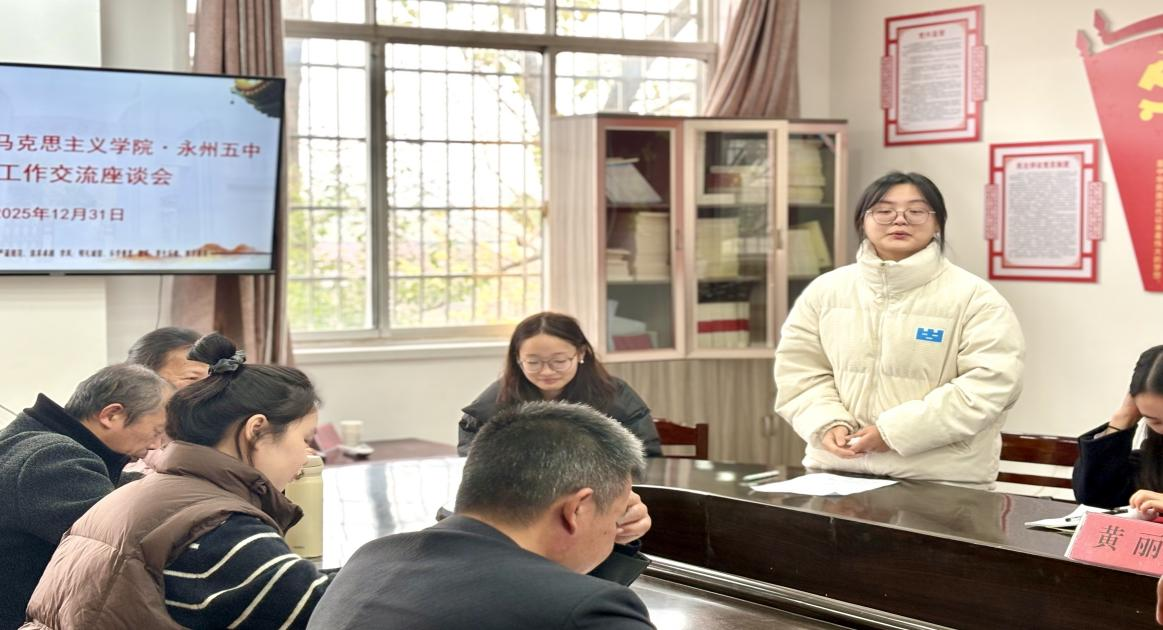 本网讯(通讯员 王忠君)12月31日,马克思主义学院院长廖雅琴带队赴永州市第五中学开展思政专业教育实习检查并召开实习工作交流座谈会。永州市第五中学党委书记伍振军、校长蒋山薇等参加座谈交流。