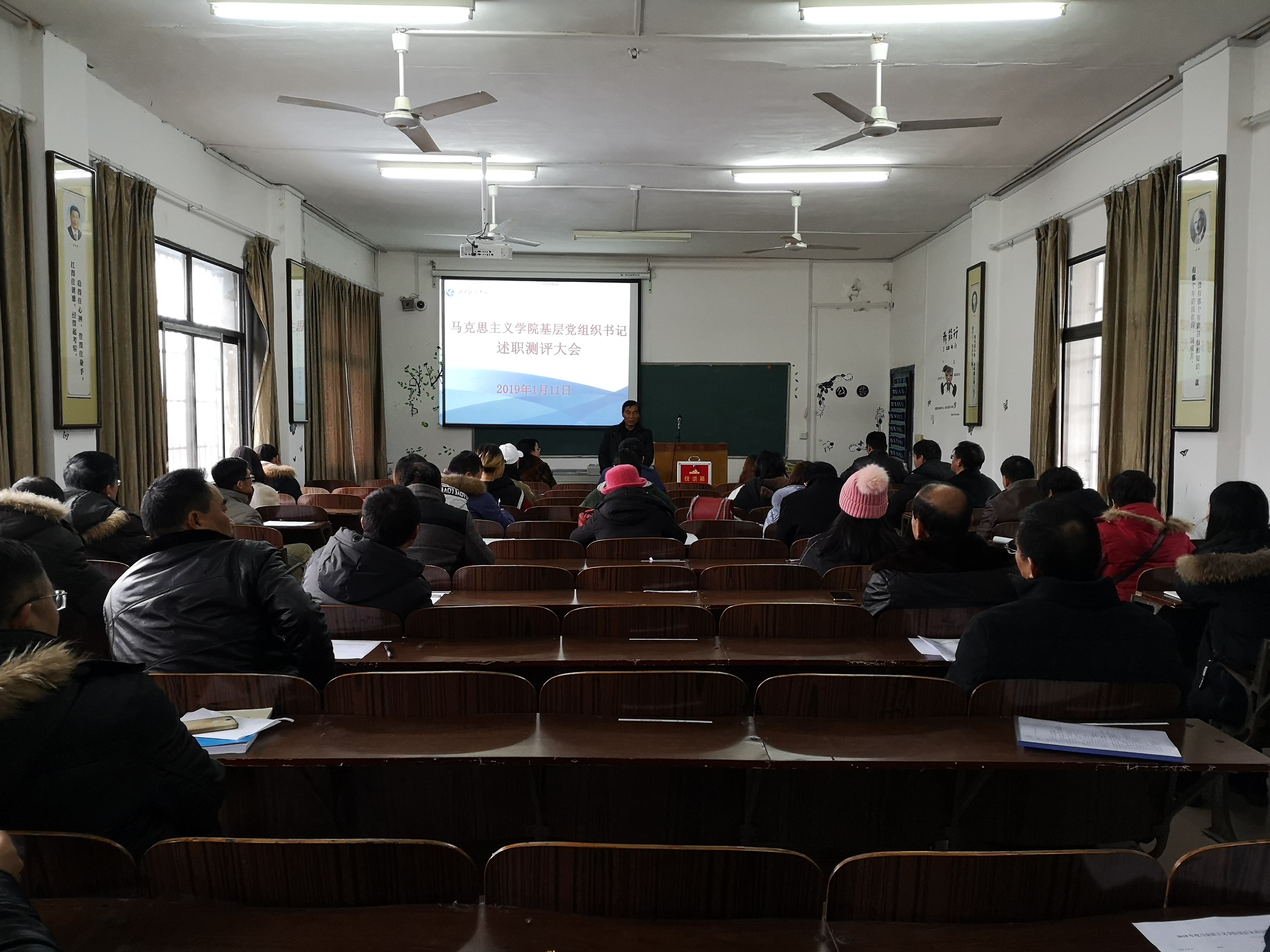 本网讯 2019年1月11日,马克思主义学院基层党组织书记述职评议大会及副职年度考核民主测评会在鹤鸣楼501同时举行。会议由马克思主义学院专职组织员唐森树同志主持,全体党员及群众代表共41人与会。