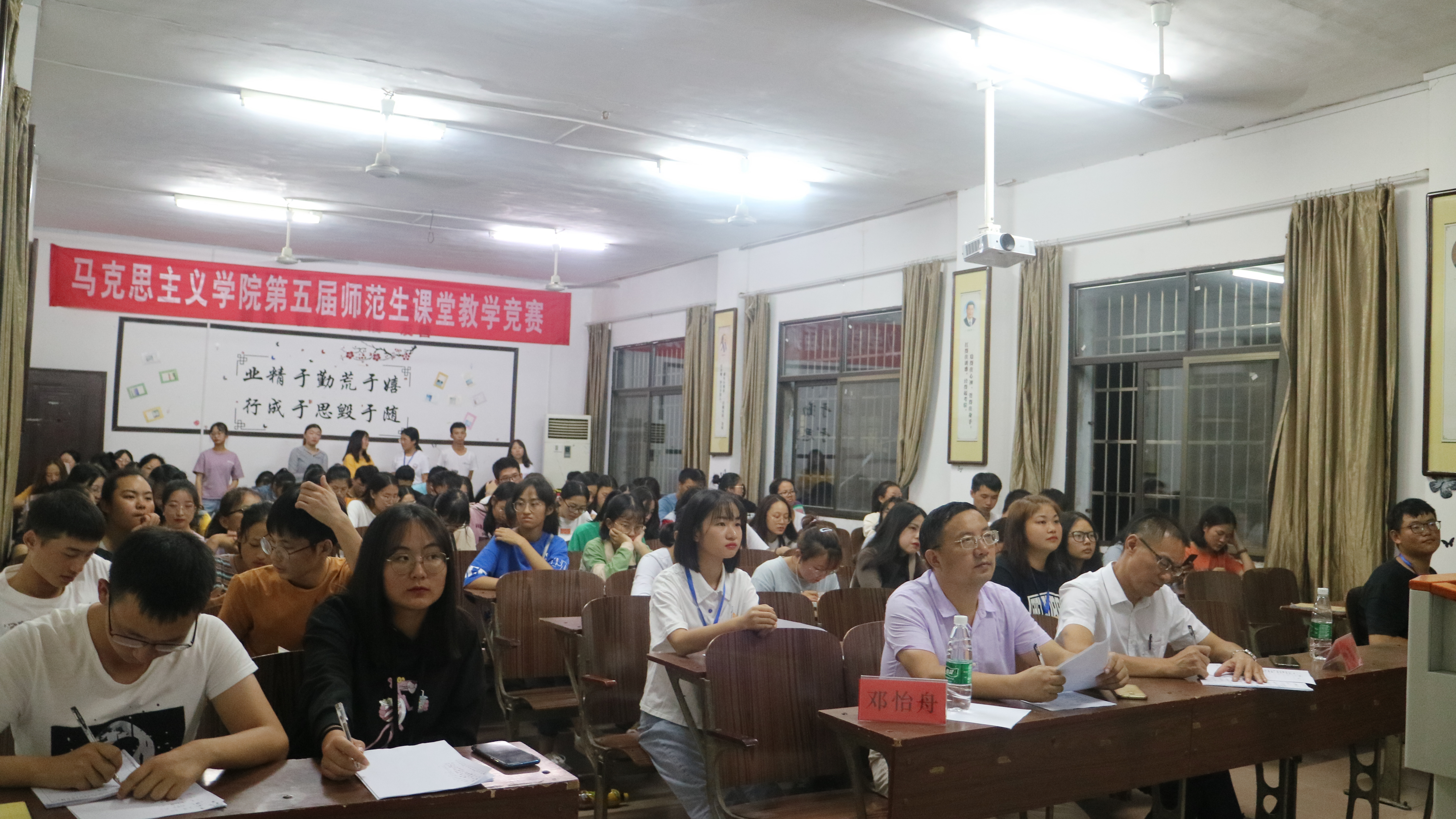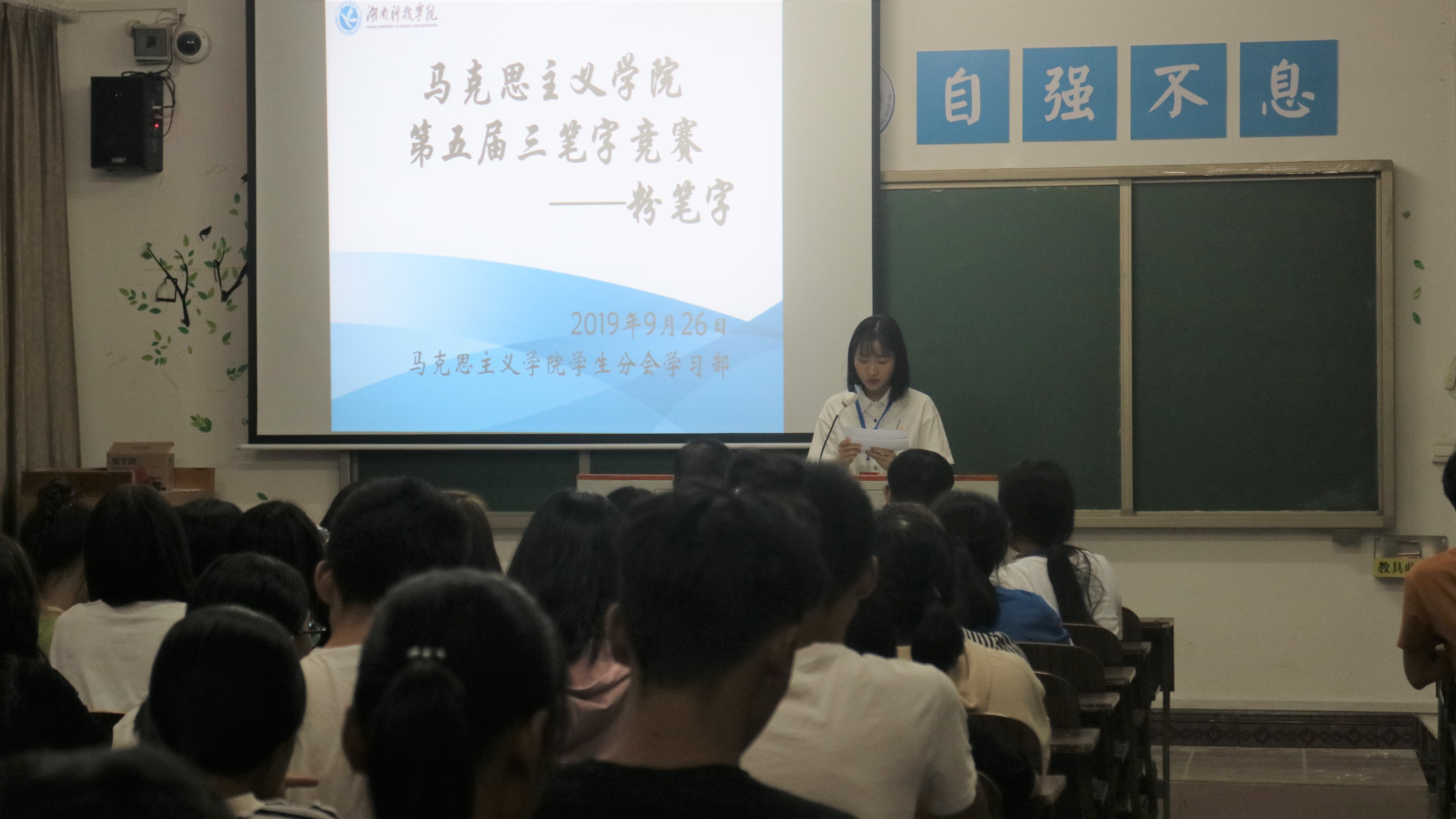 本网讯(通讯员 尹玉婷)为迎接祖国70华诞,展示我院师范生教学板书风采。9月26日晚,马克思主义学院第五届粉笔字比赛在鹤鸣楼楼501教室顺利举行。我院概论教学部主任何志平、思政系主任邓怡舟出席本次比赛并担任评委,19级全体学生观摩比赛。