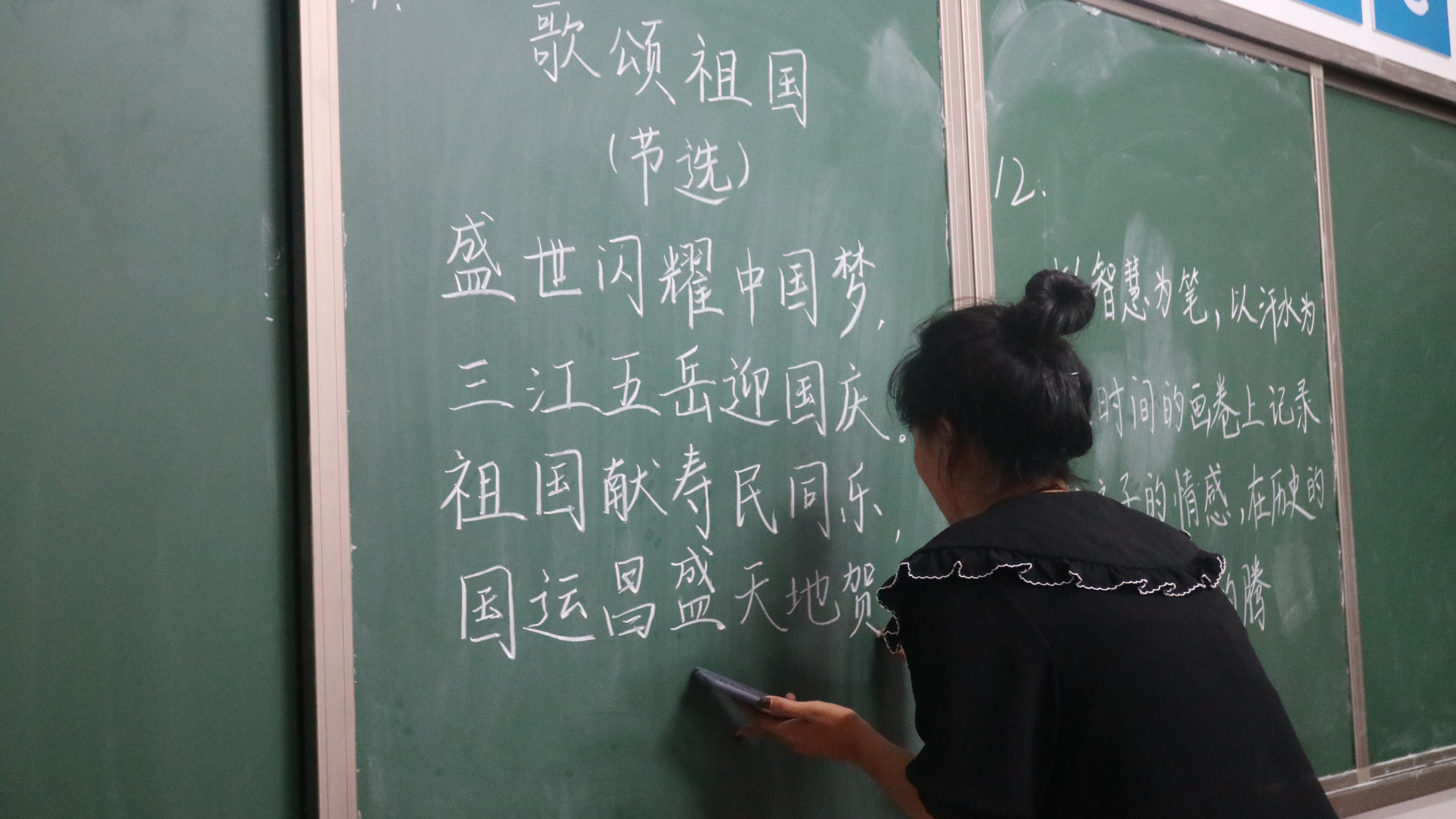 本次大赛以“笔抒中华,弘扬爱国情”为主题,采取现场书写的形式,要求参赛选手在限定的时间内完成爱国诗歌书写内容。比赛过程中,选手们全神贯注,一笔一划,工整有力,充分展示了自身风采。其中,11号池鹏同学的粉笔字作品《歌颂祖国》,排版美观,工整、清秀的粉笔字表达出了她对祖国的真挚祝福。比赛现场气氛热烈,每位参赛选手都发挥了自己最好的水平。