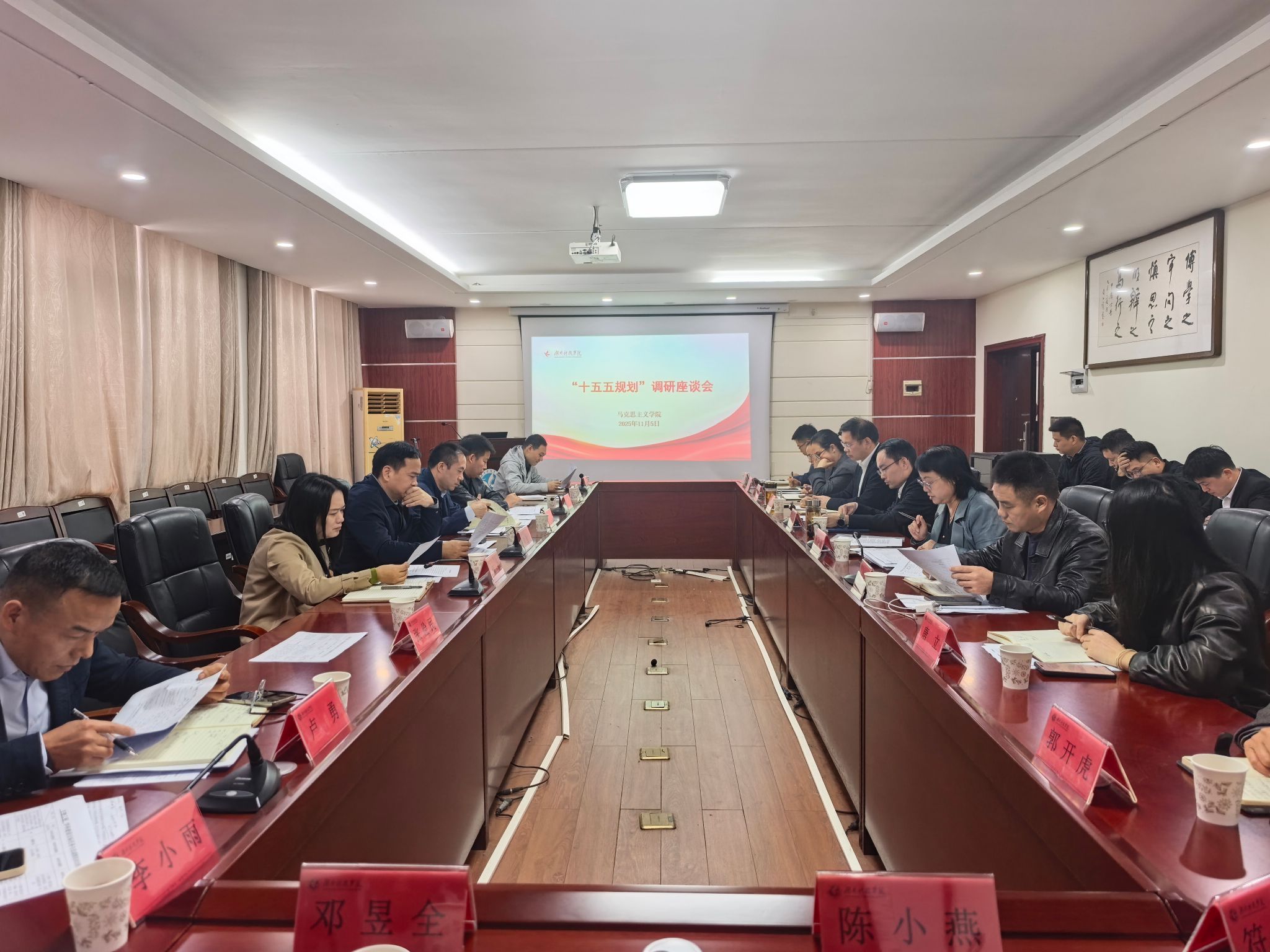 调研会上,黄创霞校长首先听取了马克思主义学院院长廖雅琴关于“十五五”规划整体思路、核心目标、重点任务及当前推进成效的汇报,随后结合两学院发展研讨会共识,针对马院建设提出明确要求。他强调,马克思主义学院作为学校思想政治教育主阵地,“十五五”规划需锚定“省内一流、特色鲜明”目标,更要以系统性举措夯实发展根基:一是打造名嘴名师梯队,内培外引,重点培育青年骨干教师,从课程思政发力,组建高水平讲师团,成为国家政策理论宣传的重要力量;二是全面提升教学质量,教师需精心备课、细心磨课,深度挖掘永州本土文化底蕴并融入教学,形成具有自身特色的精品课程;三是强化学科建设攻坚,明确“十五五”期间学科发展硬指标,全力申报教育硕士(思政方向),力争2029年获批学术硕士点,同时持续深化李达研究等永州地域文化研究、地方党史党建研究,凝练特色学科方向,打造更具竞争力的学科优势,以学科突破引领学院高质量发展。