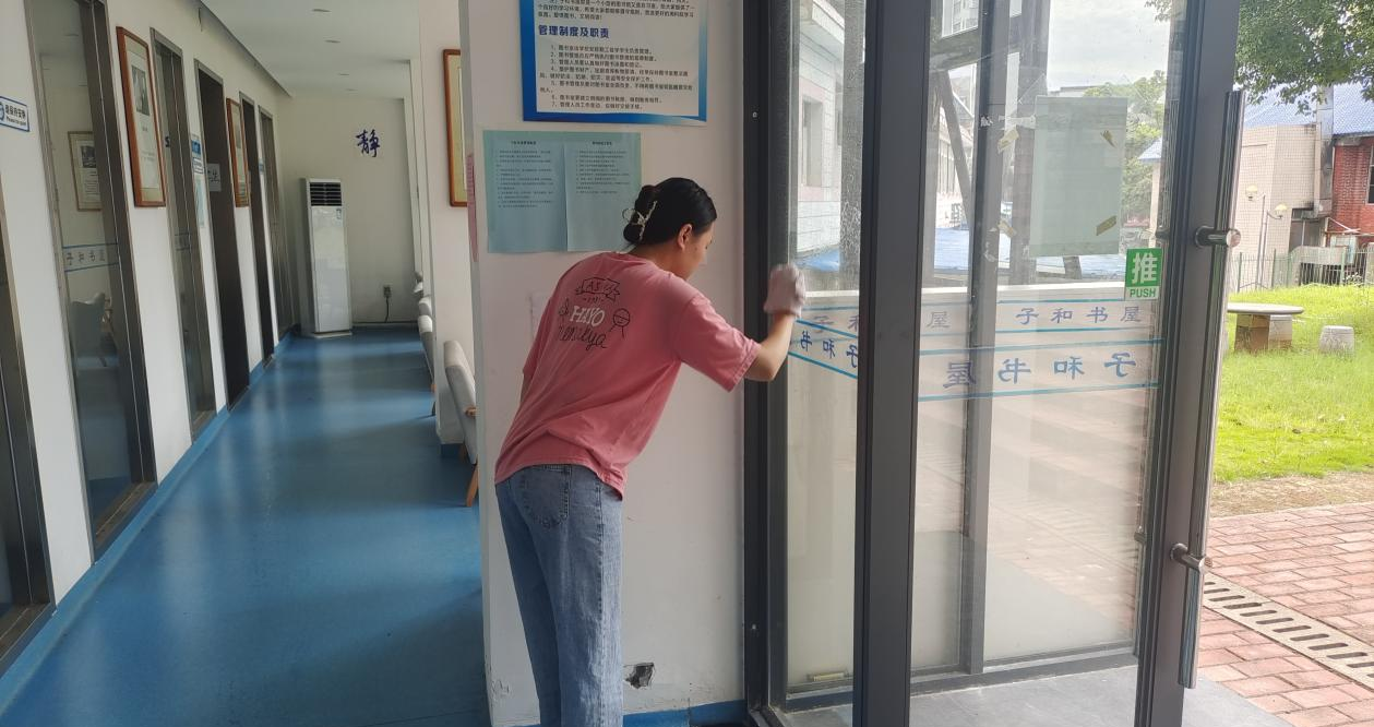 本网讯(记者 张遨宇)新学期将至,为营造干净整洁的学习环境,迎接省重点马院现场考评,8月25日上午,马克思主义学院留校考研学生利用复习闲暇时间,于鹤鸣楼及子和书屋开展“暖心清扫”活动。