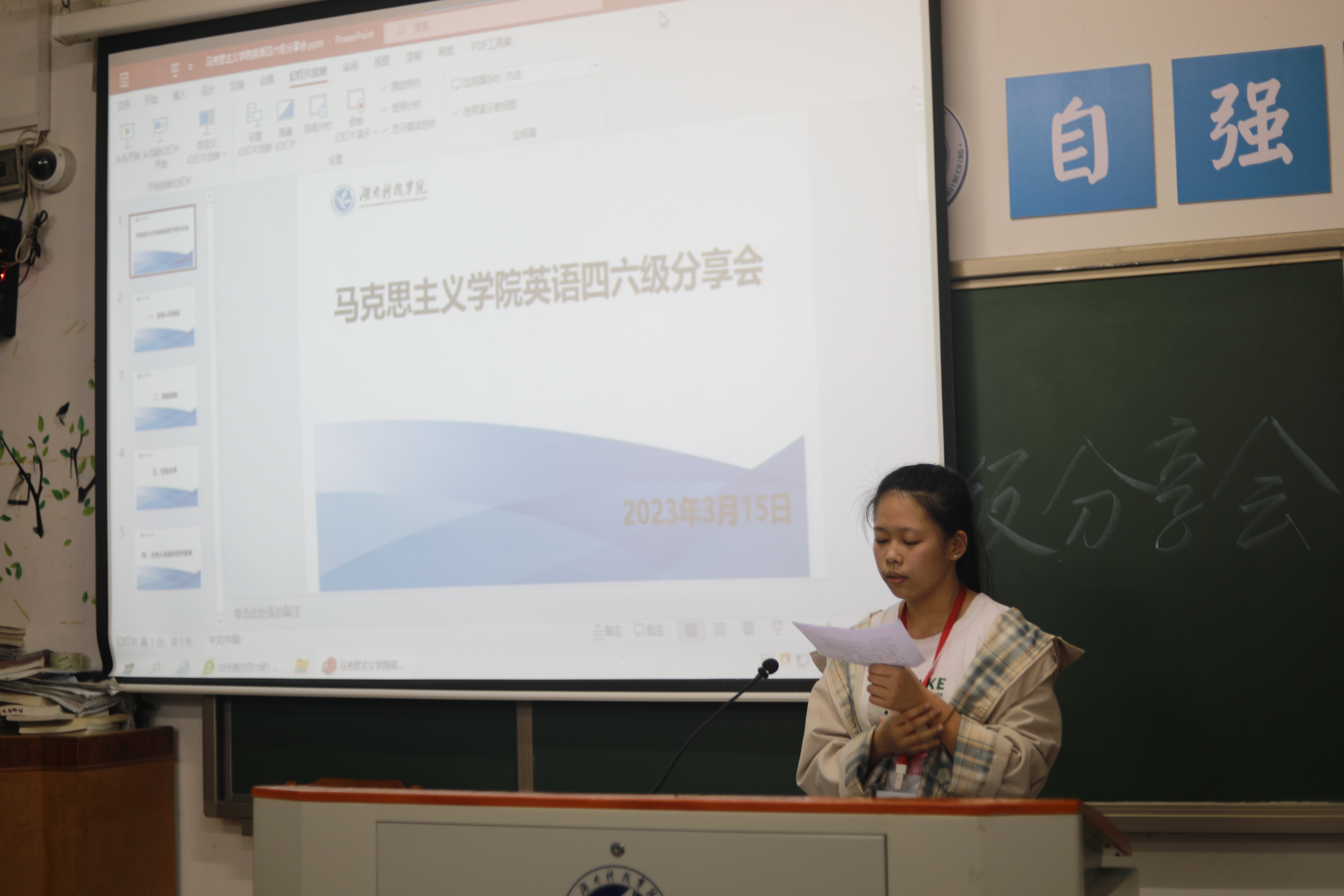 本网讯(记者 王洪、刘玉娇)为帮助2022级学生解决备考英语四六级中出现的问题,3月15日晚,马克思主义学院于鹤鸣楼501教室召开英语四六级分享会。本次活动我院4名大二优秀学长学姐作为分享人,向22级学生分享经验。