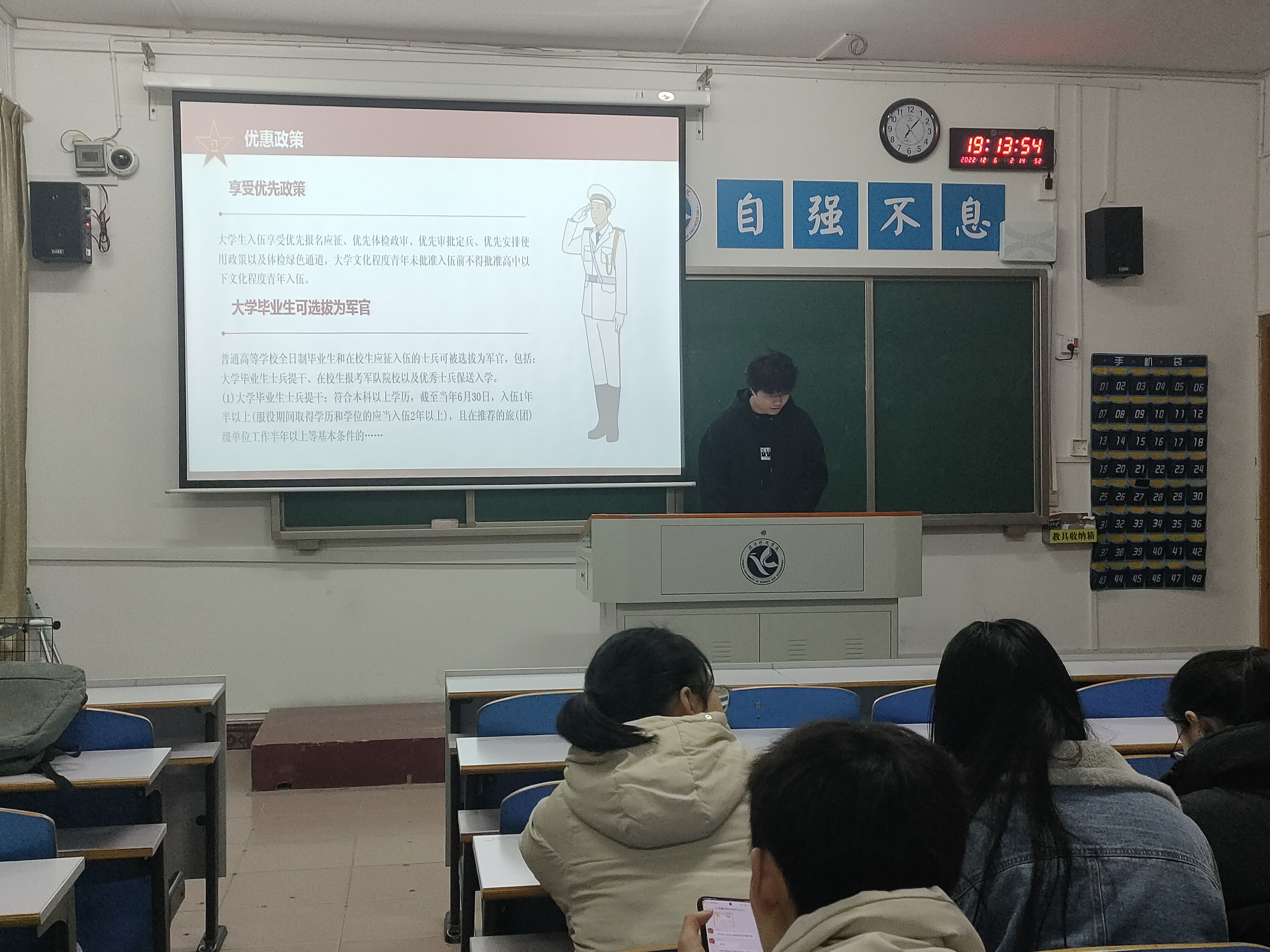 班会伊始,各班团支书向同学们讲解了应征入伍的基本条件、报名参军基本流程以及大学生入伍的优待和参军的优势,向同学们解读了大学生征兵的优惠政策,充分调动同学们应征的积极性。