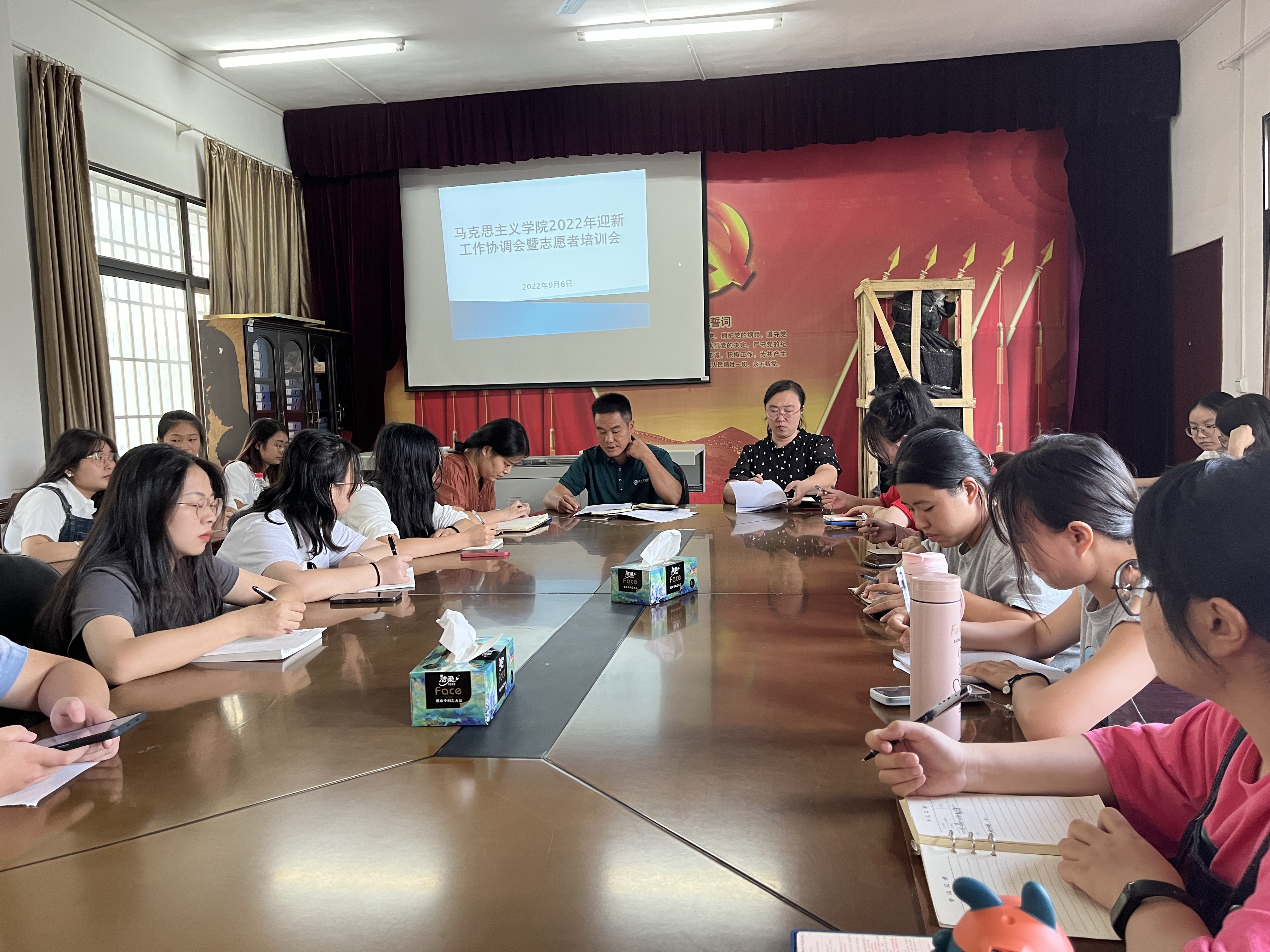 本网讯(记者 王婧)为扎实做好我院2022级迎新工作,确保疫情防控和迎新工作平稳有序开展。9月6日,我院于鹤鸣楼405教室召开2022年迎新工作协调会暨志愿者培训会。本次会议由马克思主义学院副书记兼副院长高丹主持,学工办主任王君、团总支书记胡非以及各班迎新志愿者参加本次会议。