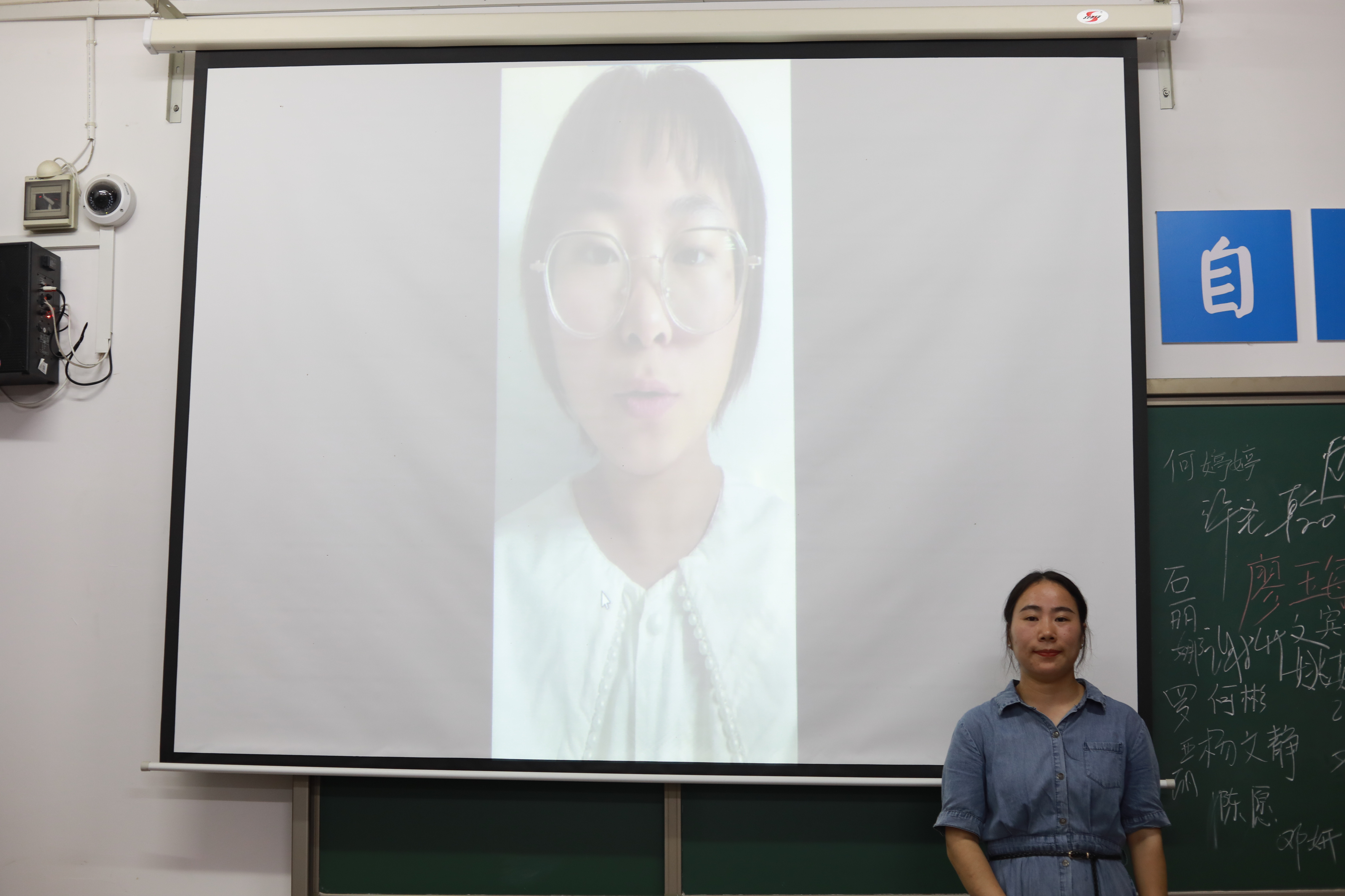 因疫情防控要求,照顾暂缓返校学生,本次见面会通过“线上+线下”形式进行。图为思政2201班岳明卓线上与班级同学们进行自我介绍。