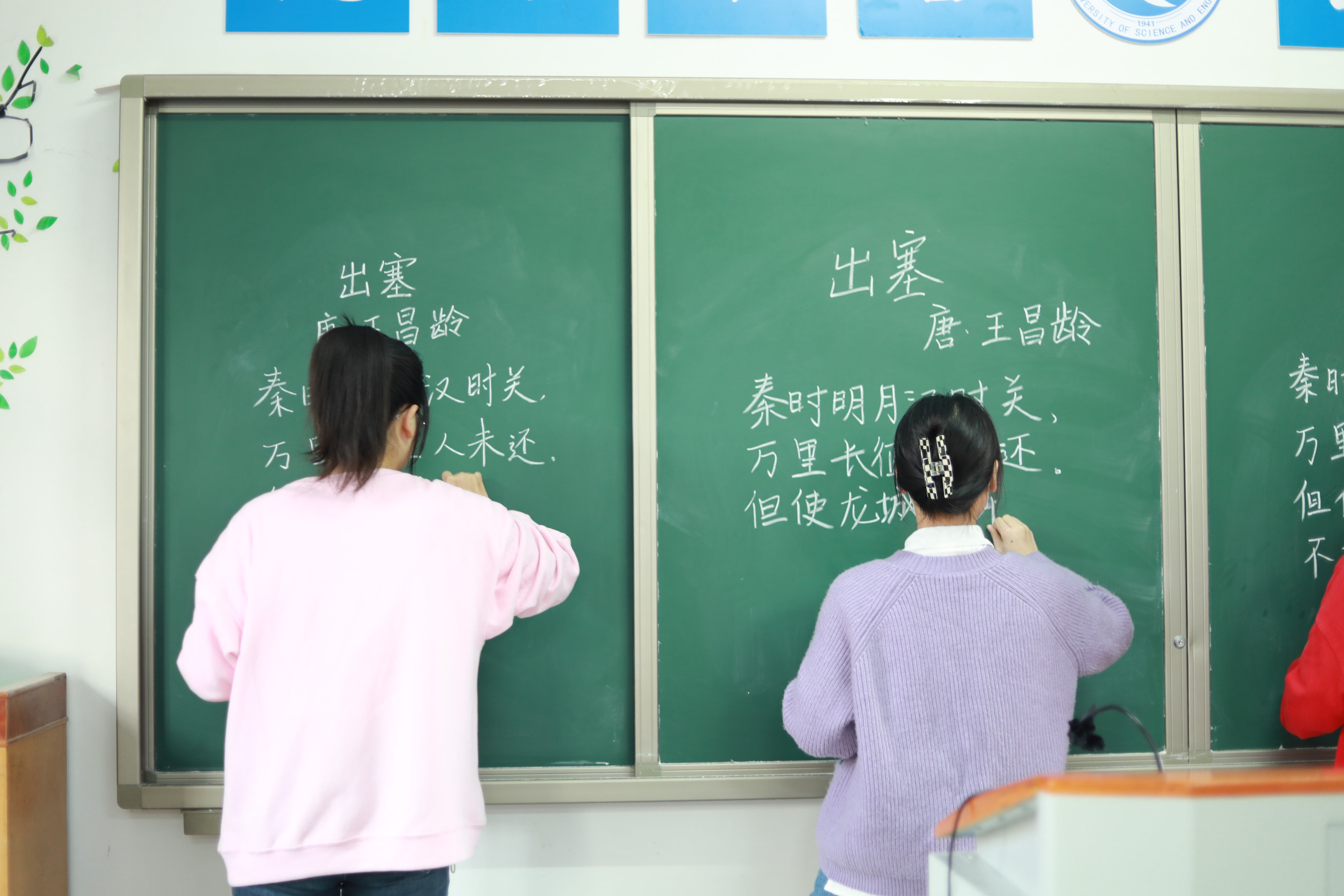 在钢笔字比赛中,共有《雁门太守行》与《长征》两首古诗供选手书写选择。粉笔字则有《芙蓉楼送辛渐》与《出塞》两首王昌龄的古诗供选手书写选择。同学们的作品或如婀娜窈窕的美人,或如矫健勇猛的壮士,或如春风拂面繁花一片,或如北风入关深沉冷峻。