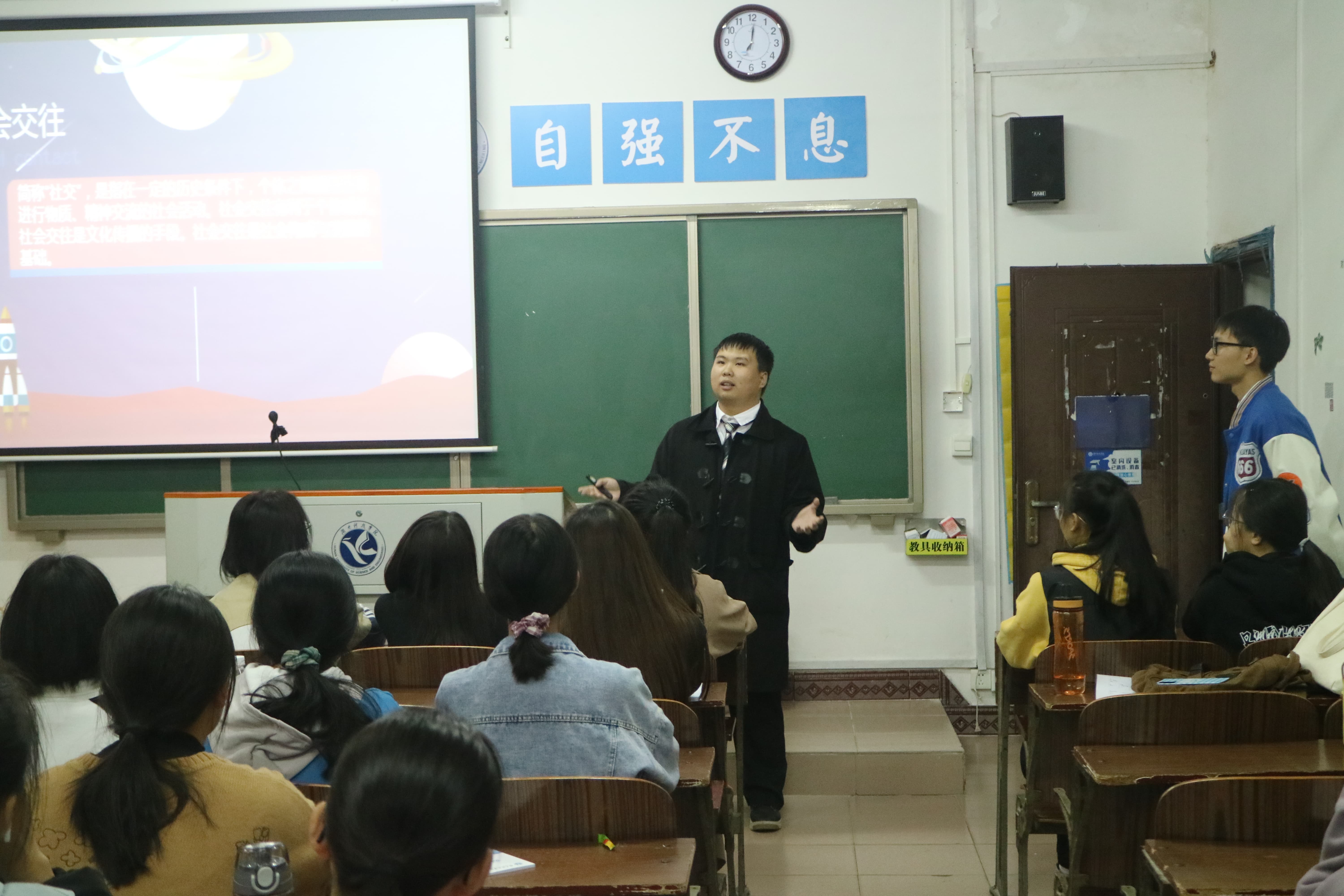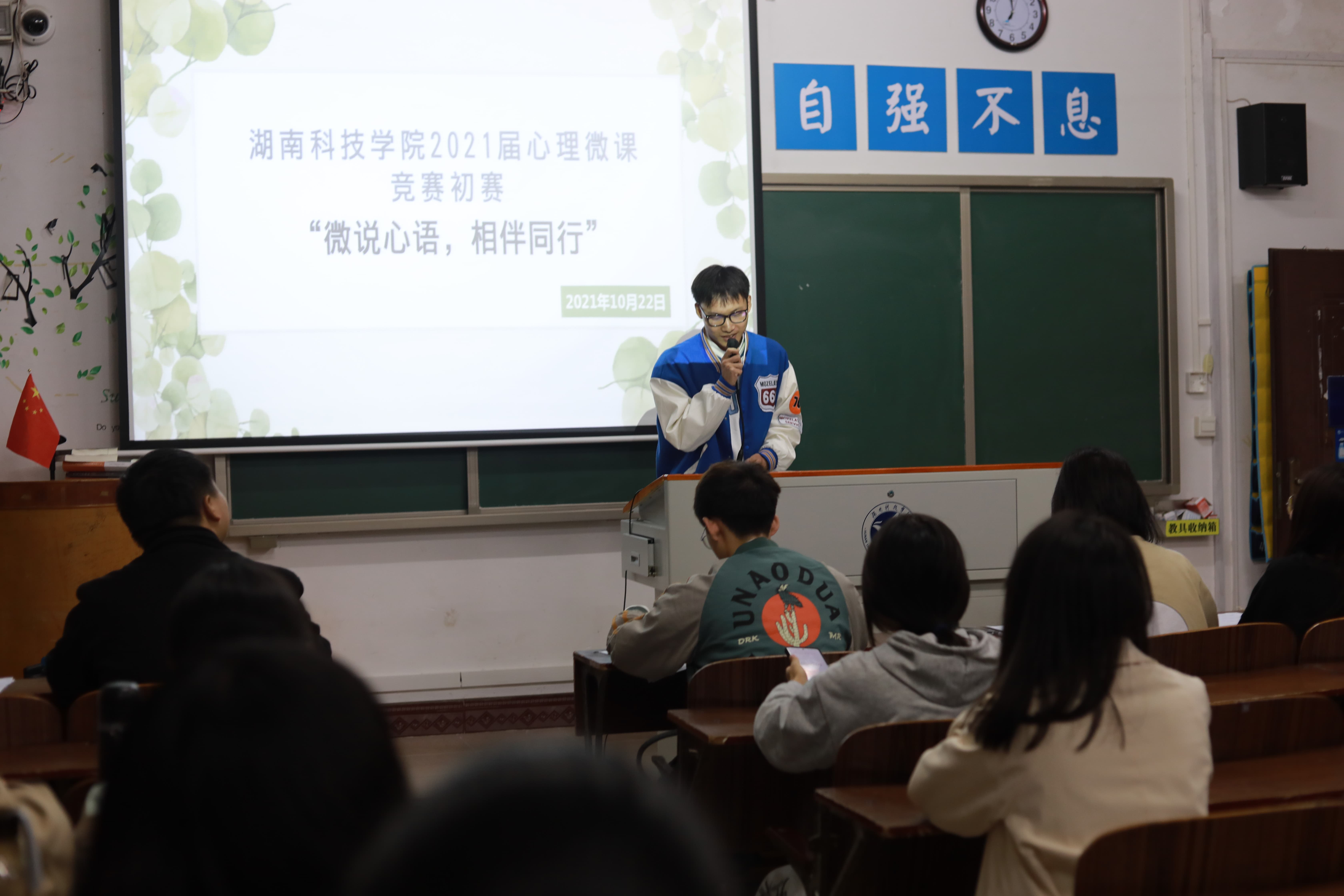 本网讯(记者 王婧)“现代人的崩溃是一种默不作声的崩溃。”10月22日晚,马克思主义学院于鹤鸣楼501教室开展“微说心语,相伴而行”心理微课比赛,学生代表张自强、周雨信、戴雅兰和谢永姣担任评委,全体21级学生参加观看。