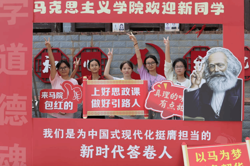 本网讯(记者 杨鑫杰)“真理的味道有点甜,你我来代言”,“来马院,包红的!”在马克思主义学院迎新报到点,这些特别的标语和手持牌吸引了2024级萌新们。为给新生提供更贴心的开学体验,我院特意在红色书屋设立迎新点,让2024级新生一踏入校园,便感受到学院浓厚的的红色文化氛围。