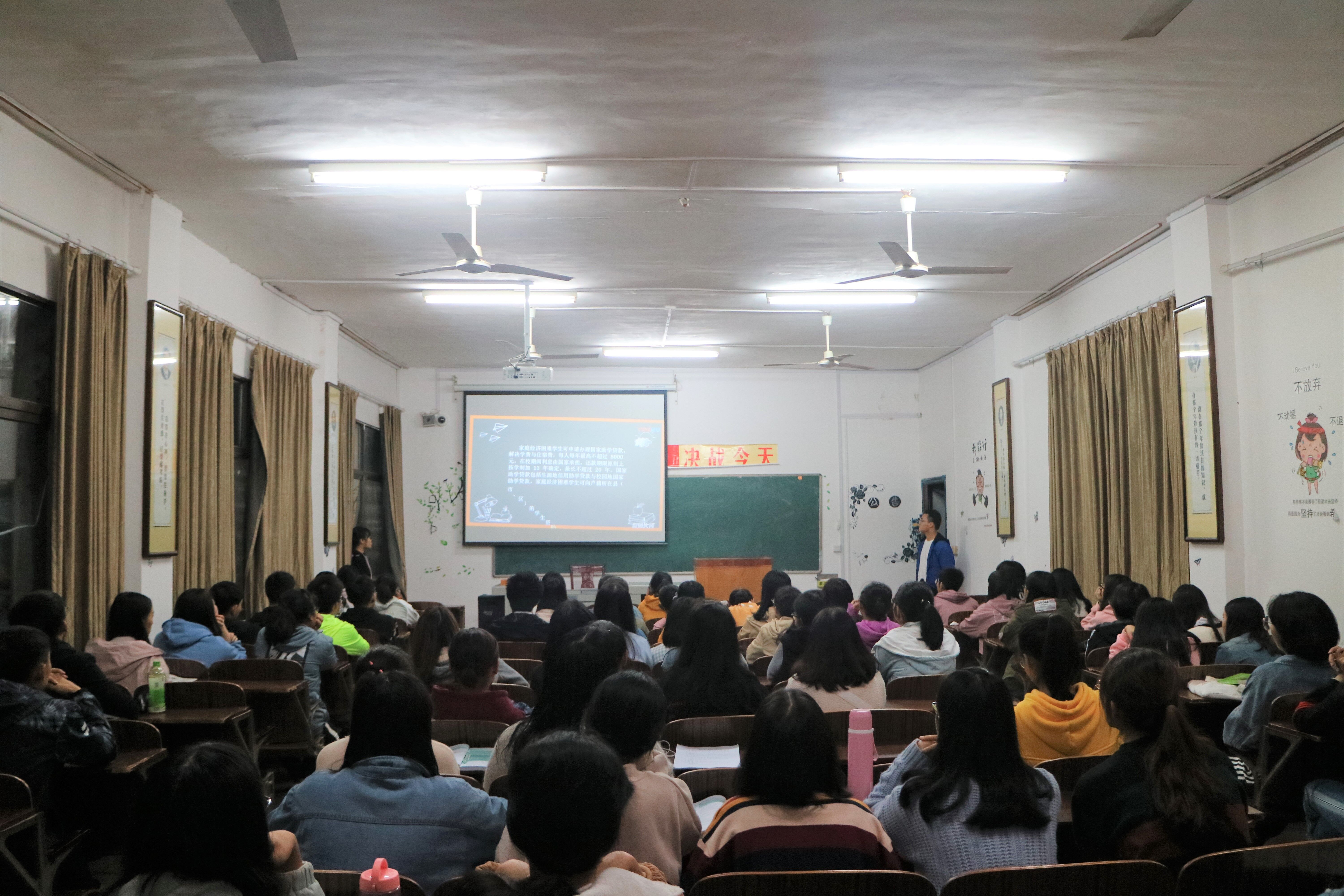 本网讯(通讯员 黎雪平 尹玉婷)为使学生更好的了解国家资助政策,树立成才感恩抱负。马克思主义学院于10月23日晚在鹤鸣楼501教室举行励志交流会,18级全体学生参加。