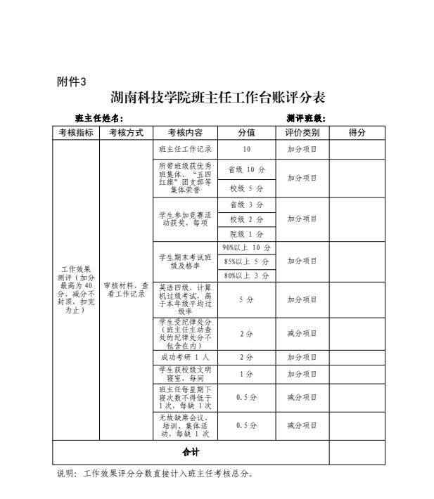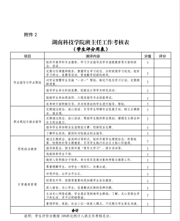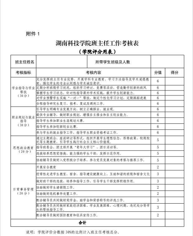 工作考核小组,由主管学生工作的学院领导任组长,具体负责本学院班主任工作的考核。考核实施评分制,学院评议占 30%(见附表),学生评议占 30%(见附表),班主任工作台账占 40%。