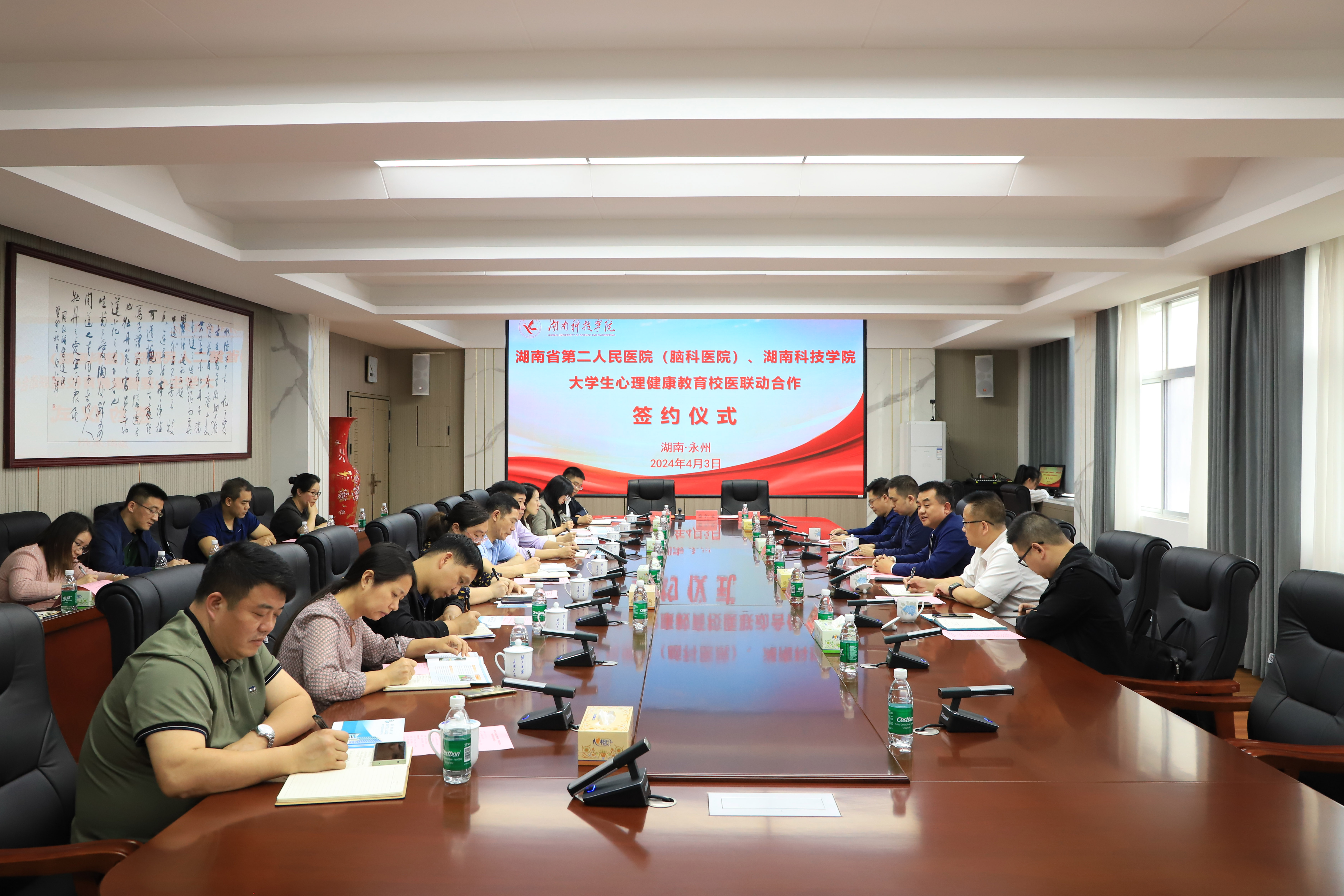 本网讯 4月3日,今年会与湖南省第二人民医院(湖南省脑科医院)举行“校医合作”签约仪式。湖南省第二人民医院党委副书记陈勇 ,永州市脑科医院党委书记、主任医师龙海鹏,校党委委员、副校长吴小林出席会议。