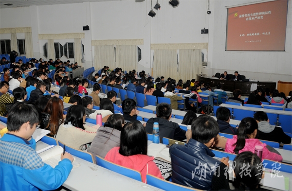 校党委副书记唐艳明以“坚持从严治党,保持党的先进性和纯洁性”为主题做了精彩开讲。讲座中,唐艳明生动地阐述了党的先进性的基本内涵及中国共产党保持先进性的基本要求。唐艳明强调,党在长期奋斗过程中形成的优良传统和作风,是党的先进性和纯洁性的具体体现,也是每一名党员一刻也不能丢掉的传家宝,是完成党的历史使命的根本保证。唐艳明教育全体学生党员,必须在思想上、组织上、作风上保持党的先进性和纯洁性,坚定信仰,求真务实,与时俱进。