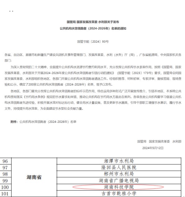 本网讯(通讯员 王艳香)近日,国家机关事务管理局、国家发展改革委、水利部联合发布了《关于发布公共机构水效领跑者(2024-2026年)名单的通知》(国管节能〔2024〕93号),公布了200家公共机构水效领跑者(2024-2026年)名单,今年会名列其中,同时也是湖南省唯一获此殊荣的高校。