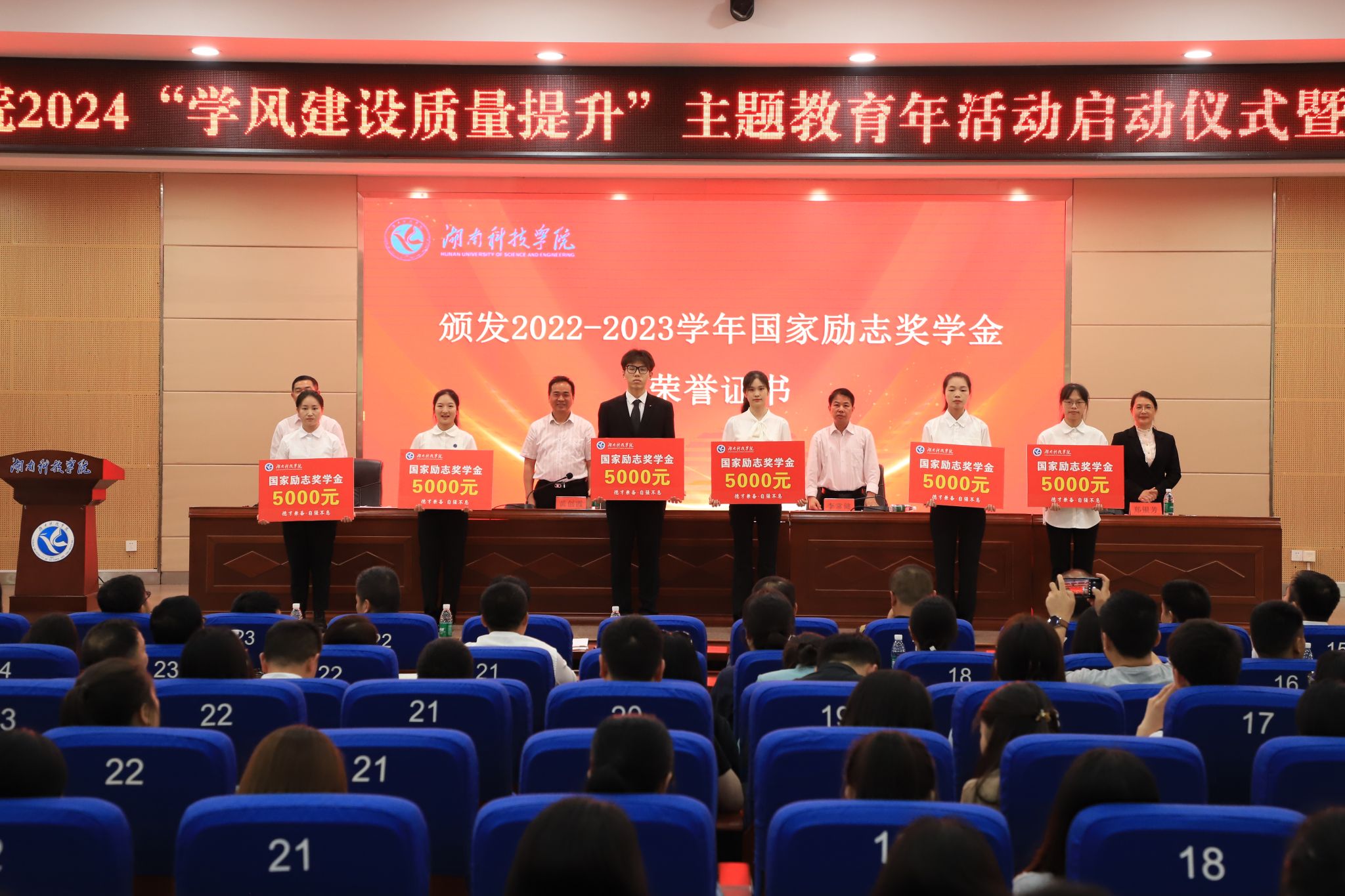 郑银芳宣读表彰文件。朱希等20名同学获评2022-2023学年度国家奖学金,李椿桃等455名同学获评2022-2023学年度国家励志奖学金,法学2103班等40个班级获评“优良学风班级”。
