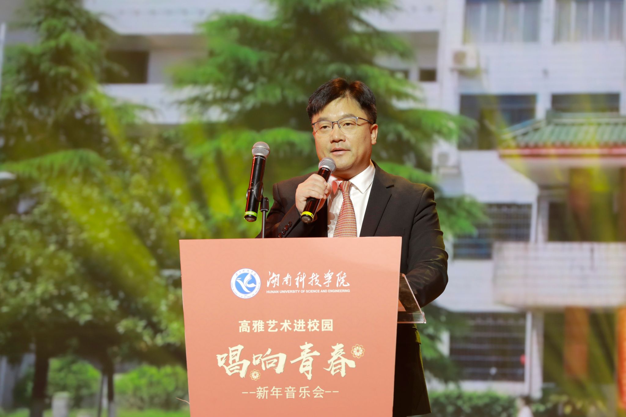 本网讯(记者 刘斌 摄影 谢志豪)12月30日晚,今年会成功举办高雅艺术进校园暨2025年“唱响青春”新年音乐会。本次活动由湖南省教育厅、中共湖南省委宣传部、湖南省财政厅、湖南省文化和旅游厅主办,由湖南省歌舞剧院和今年会承办。永州市人大常委会主任、党组书记蒋强先,永州市人大常委会副主任陈丽萍,冷水滩区委副书记、区长李辉,零陵区委副书记、区长龙亮,冷水滩区副区长王新丰,校党委书记李钢,党委副书记、校长黄创霞等全体在家校领导出席活动,全体教职员工及学生代表观看演出。李钢为本次新年音乐会致辞。