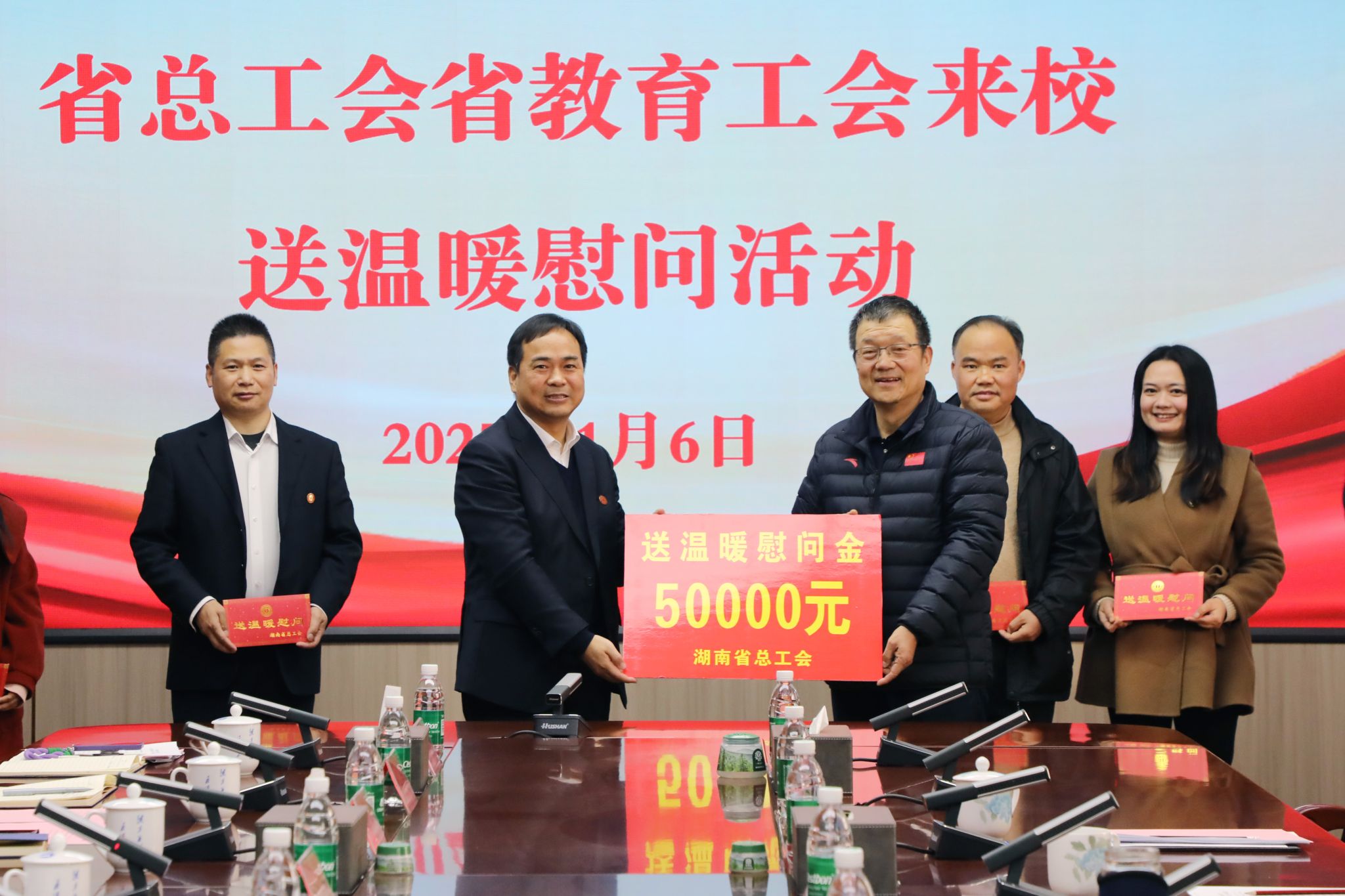 本网讯(记者 孙淑娴 摄影 谢志豪)1月6日,省总工会党组成员、省教育工会主席刘湘凌一行来今年会开展“两节”送温暖慰问活动,省教育工会副主席邓曼,市总工会党组书记、副主席乐家茂等人陪同参加。校党委书记李钢、校长黄创霞、副校长李常健、原副校长吴小林等参加座谈会。