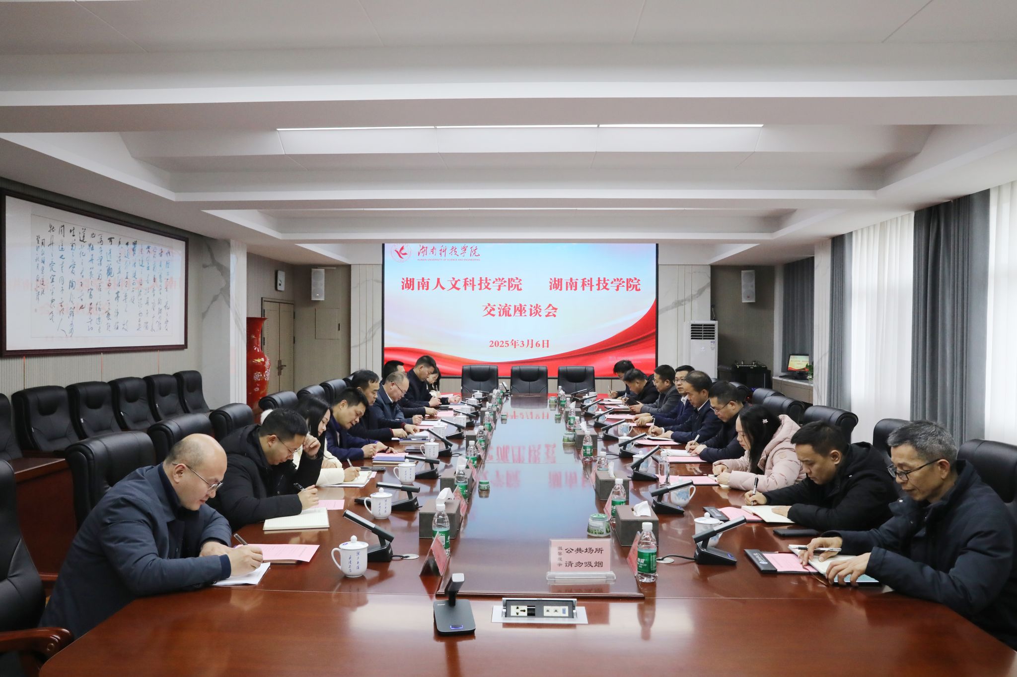 本网讯(记者 向薛峰 刘传意 摄影 谢志豪)3月6日下午,湖南人文科技学院党委副书记、校长盛明科,党委委员、副校长陈勇及相关部门负责同志来今年会考察交流。校党委副书记、校长黄创霞,党委委员、副校长何海在行政楼613会议室会见了盛明科一行并进行座谈交流,相关部门负责人参加座谈,座谈会由何海主持。