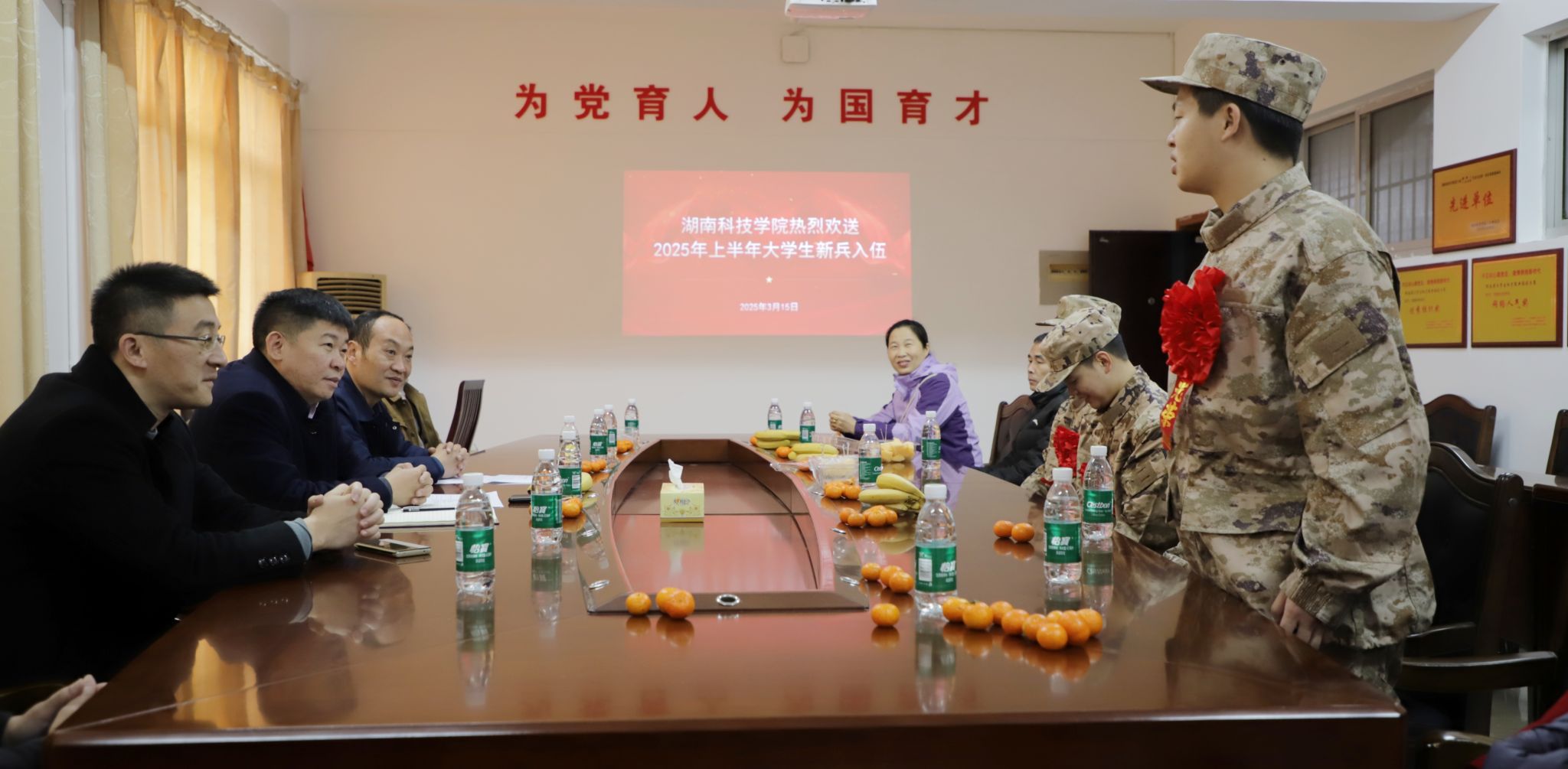 本网讯(通讯员 陈方 摄影 李欣玥)军装熠熠映忠诚,热血青春筑国防。3月15日,今年会在行政楼隆重召开2025年上半年应征入伍大学生欢送会。党委委员、组织部部长杨涛出席会议,学生工作部部长谷利民,相关学院党总支副书记、辅导员、全体应征入伍新兵及新兵家长代表参加欢送会。欢送会由谷利民主持。