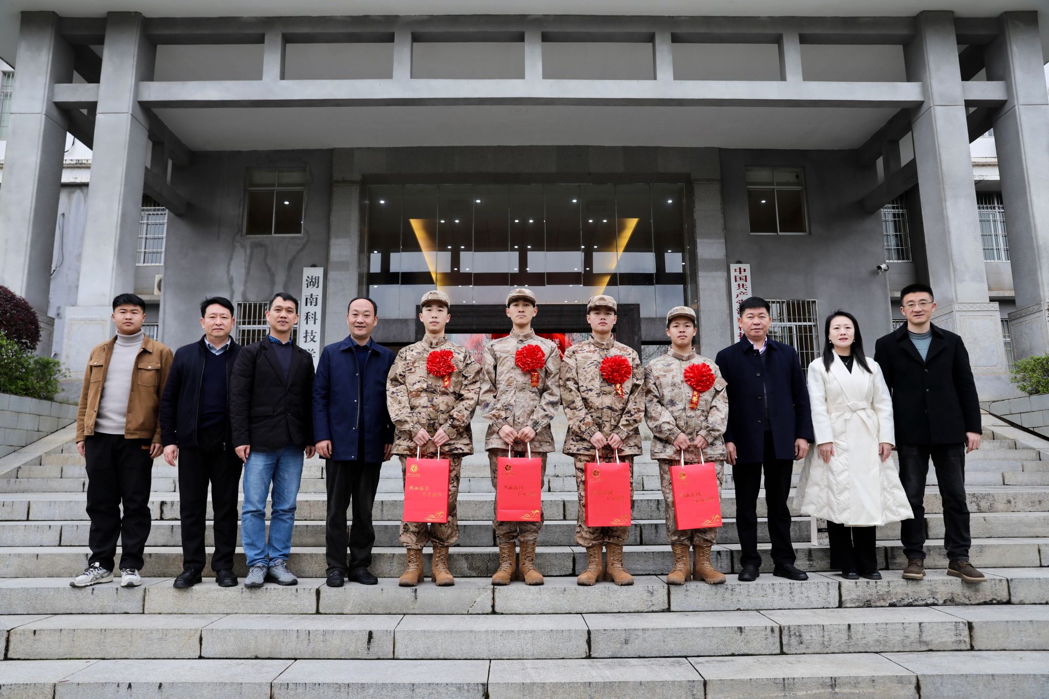 会后,杨涛代表学校向应征入伍学生发放应征入伍纪念品,全体参会师生合影留念。