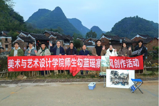 学院持续推动艺术赋能乡村振兴,与勾蓝瑶寨等当地村落建立了紧密的合作关系,成为艺术赋能乡村振兴的典范。每年组织师生两次赴瑶寨开展驻地创作,通过“田野调研+艺术介入+产业孵化”三阶段实践,将瑶族建筑、织锦、民俗等元素融入现代设计,深度参与村庄的环境设计、文旅产品创作等,助力地方文化产业的发展。村民何树英大姐感慨:“以前觉得艺术离我们很远,现在才知道,画笔真的能‘画’出好日子!”