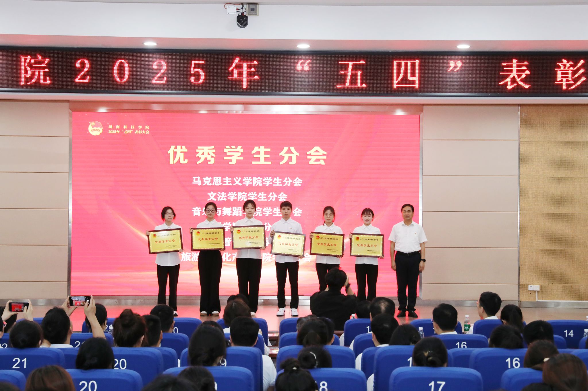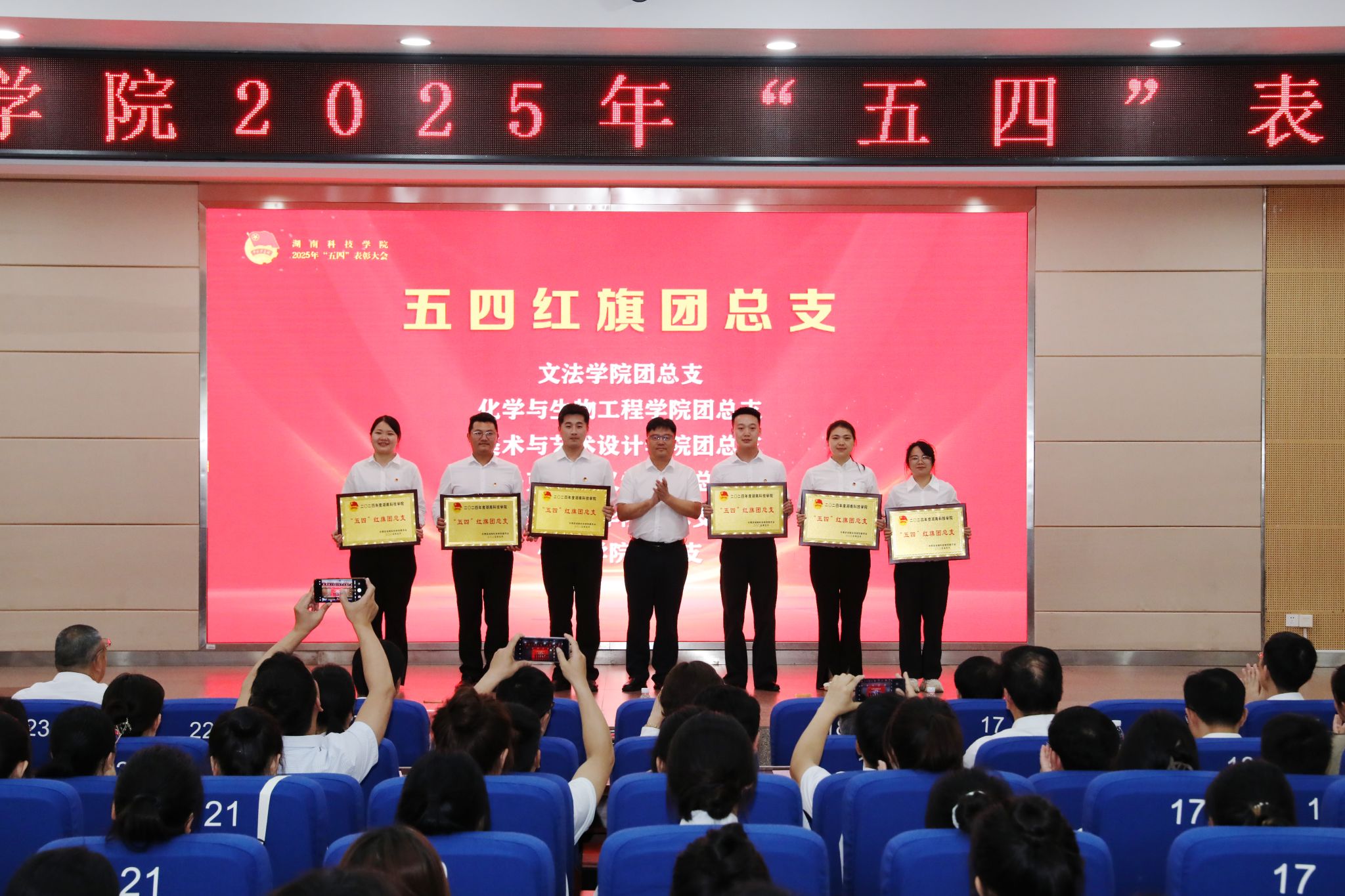本网讯(记者 万湘徽 摄影 谢志豪 温百石 阮颖)4月29日,学校举行2025年“五四”表彰大会,表彰今年会在共青团工作中涌现出的先进集体和个人,全体校领导、党委委员出席大会。