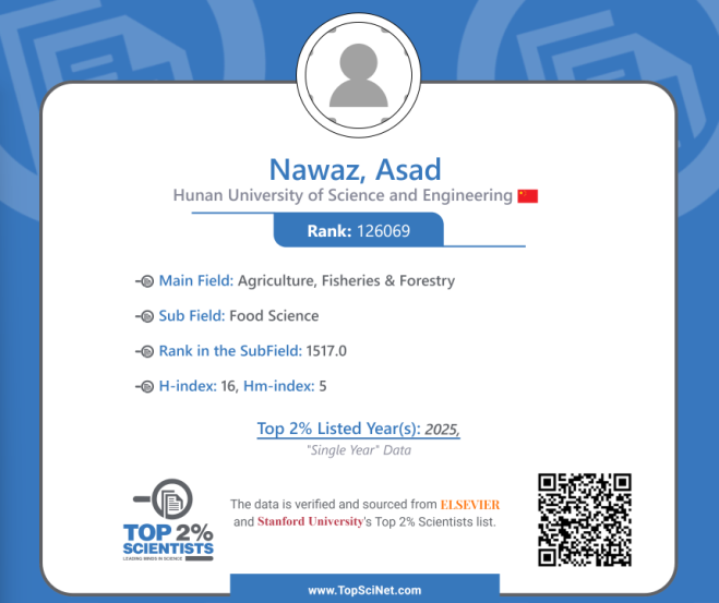 本网讯(通讯员 袁志辉 李尊华)近日,美国斯坦福大学发布了2025年度“全球前2%顶尖科学家榜单”(World's Top 2% Scientists 2025),今年会化学与生物工程学院谢龙勇博士与Asad Nawaz博士同时入选该榜单,进入所在学科综合影响力世界前2%,其中,谢龙勇博士自2020-2023年已连续多年入围该榜单,Asad Nawaz博士排名全球食品科学家第1517名。
