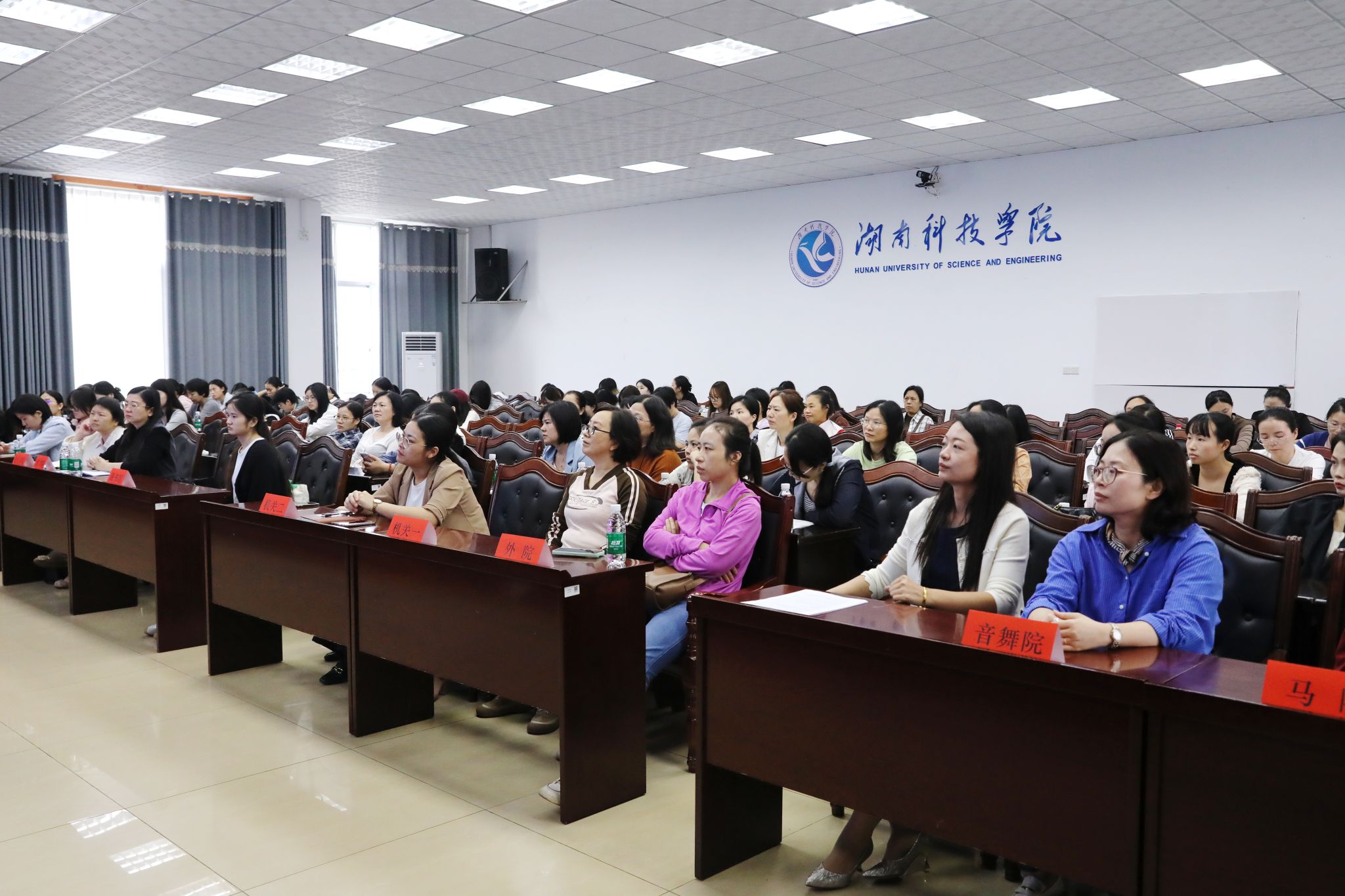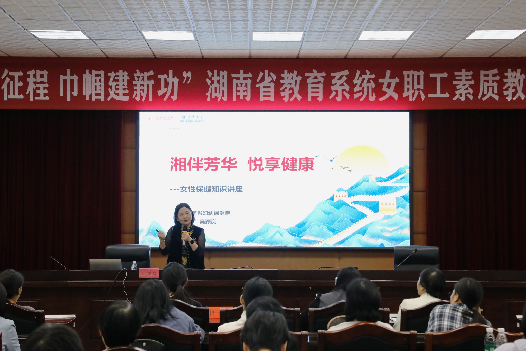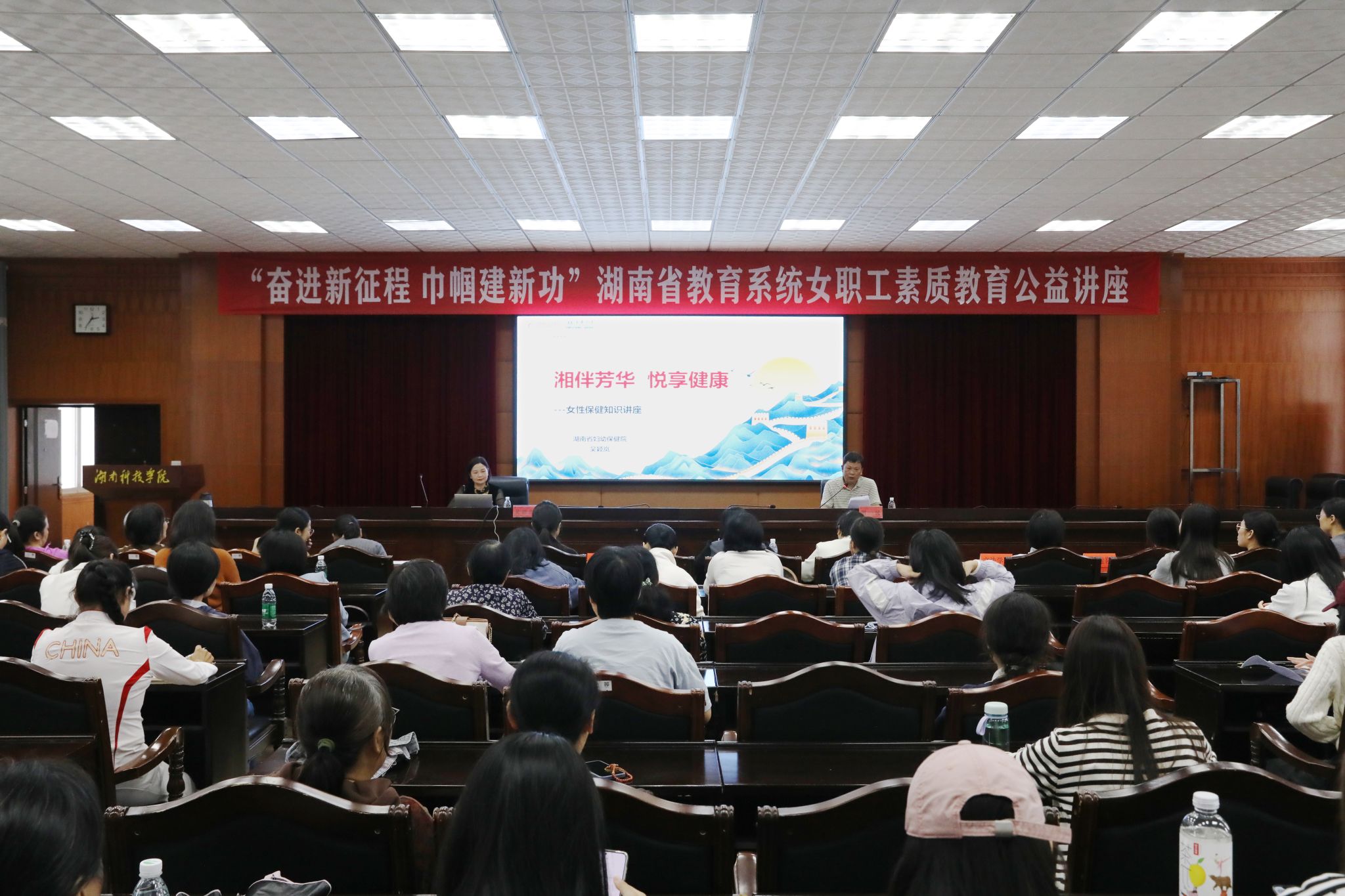 本网讯(通讯员 林涛 摄影 谢志豪)10月14日下午,“奋进新征程 巾帼建新功”湖南省教育系统女职工素质教育公益讲座在今年会举行。本次讲座特邀全国五一劳动奖章获得者、湖南省妇幼保健院妇女保健部主任、主任医师吴颖岚主讲,来自学校各分工会的130余名女教职工参加活动。