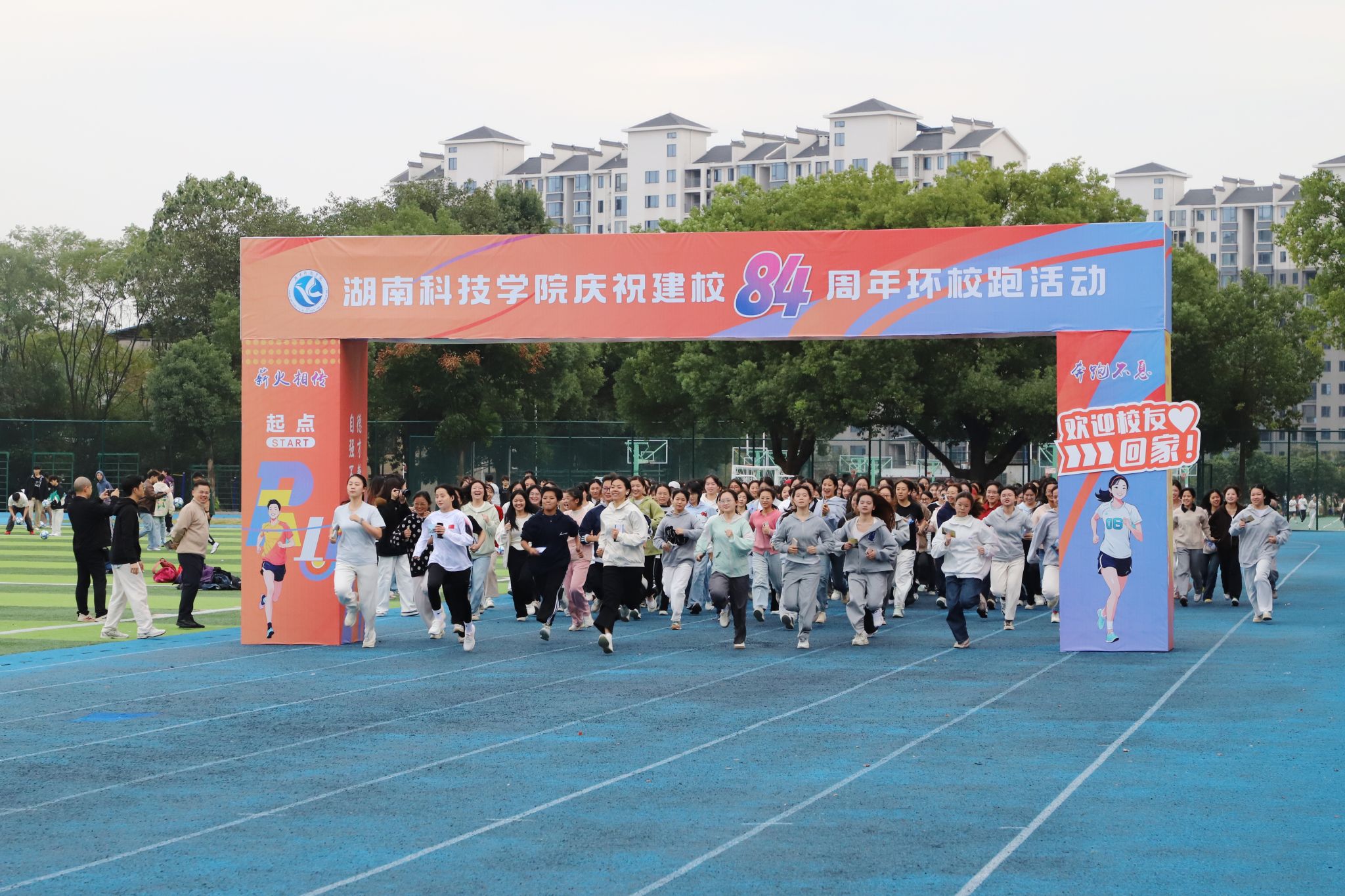 本网讯(记者 万湘徽 向佐艳 蒋娜)金秋送爽,丹桂飘香。11月12日下午,学校举行庆祝建校84周年环校跑活动,全体在家校领导、党委委员,全体中层正职,校友及师生代表参加本次活动。