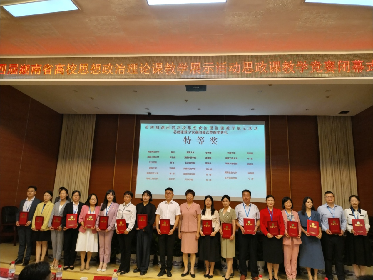 本网讯(通讯员 易倩文)9月23日,由湖南省教育厅主办的第四届湖南省高校思想政治理论课教学展示活动思政课教学竞赛在湖南工商大学举行。经过激烈角逐,马克思主义学院周梅、谢周艳两位教师分别荣获大赛本科组《思想道德与法治》《马克思主义基本原理》课特等奖,毛文杰荣获大赛本科组《习近平新时代中国特色社会主义思想概论》一等奖,刘克方荣获大赛本科组《中国近现代史纲要》二等奖,实现了今年会在省级思想政治理论课教学展示活动思政课教学竞赛新的突破。