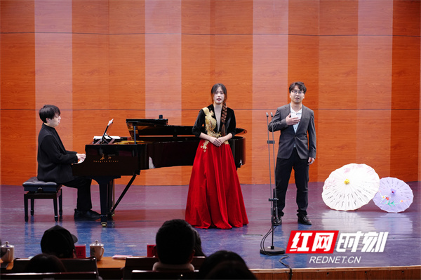 音乐会现场,从柳宗元谪居永州时写下的《零陵早春》和《渔翁》,到气壮山河的《满江红》,以及理学开山周敦颐的散文《爱莲说》,精心筛选的19首曲目全部由在读大学生担纲演唱。这种强烈的“沉浸感”与“代入感”,让传统文化变成“耳畔的旋律”。“歌声像一座桥,让我直接走进了诗人的情感世界里。”财管2401班学生谷利梅在观演后说。