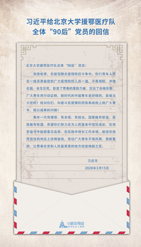 新华社北京3月16日电 中共中央总书记、国家主席、中央军委主席习近平3月15日给北京大学援鄂医疗队全体“90后”党员回信,向他们和奋斗在疫情防控各条战线上的广大青年致以诚挚的问候。
